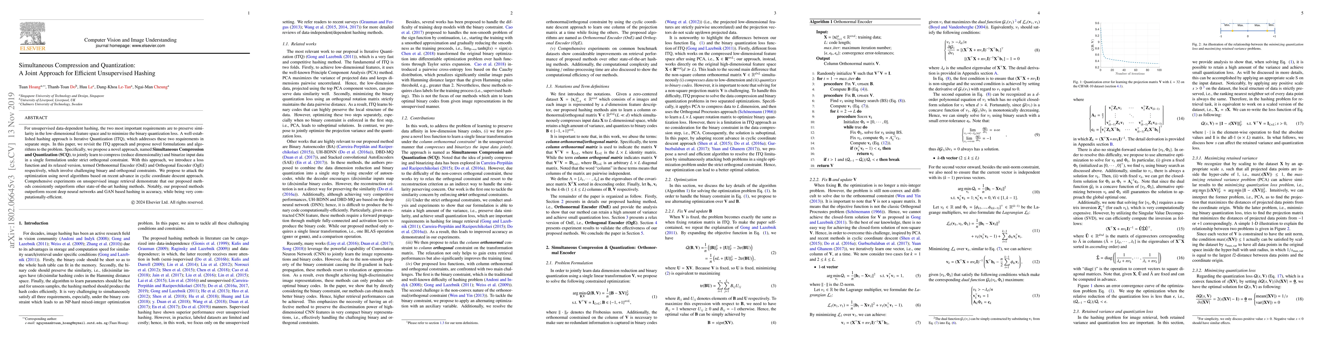 For unsupervised data-dependent hashing, the two most important requirements are to preserve similarity in the low-dimensional feature space and to minimize the binary quantization loss. A well-established hashing approach is Iterative Quantization (ITQ), which addresses these two requirements in separate steps. In this paper, we revisit the ITQ approach and propose novel formulations and algorithms to the problem. Specifically, we propose a novel approach, named Simultaneous Compression and Quantization (SCQ), to jointly learn to compress (reduce dimensionality) and binarize input data in a single formulation under strict orthogonal constraint. With this approach, we introduce a loss function and its relaxed version, termed Orthonormal Encoder (OnE) and Orthogonal Encoder (OgE) respectively, which involve challenging binary and orthogonal constraints. We propose to attack the optimization using novel algorithms based on recent advances in cyclic coordinate descent approach. Comprehensive experiments on unsupervised image retrieval demonstrate that our proposed methods consistently outperform other state-of-the-art hashing methods. Notably, our proposed methods outperform recent deep neural networks and GAN based hashing in accuracy, while being very computationally-efficient.