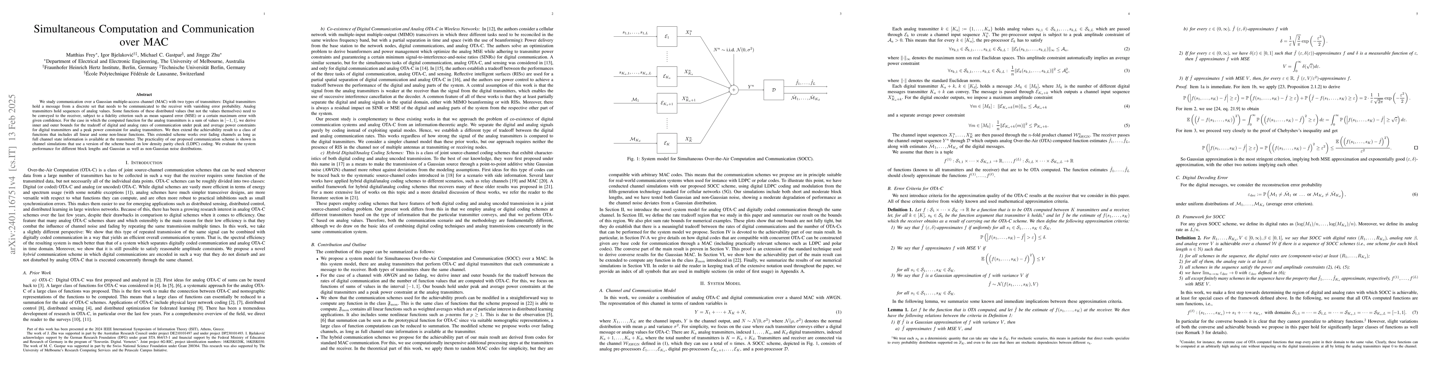 We study communication over a Gaussian multiple-access channel (MAC) with two types of transmitters: Digital transmitters hold a message from a discrete set that needs to be communicated to the receiver with vanishing error probability. Analog transmitters hold sequences of analog values, and some functions of these distributed values (but not the values themselves) need to be conveyed to the receiver, subject to a fidelity criterion such as mean squared error (MSE) or a certain maximum error with given confidence. For the case in which the computed function for the analog transmitters is a sum of values in [-1,1], we derive inner and outer bounds for the tradeoff of digital and analog rates of communication under peak and average power constraints for digital transmitters and a peak power constraint for analog transmitters. We then extend the achievability result to a class of functions that includes all linear and some non-linear functions. The practicality of our proposed communication scheme is shown in channel simulations that use a version of the scheme based on low density parity check (LDPC) coding and evaluate the system performance for different block lengths and Gaussian as well as non-Gaussian noise distributions.