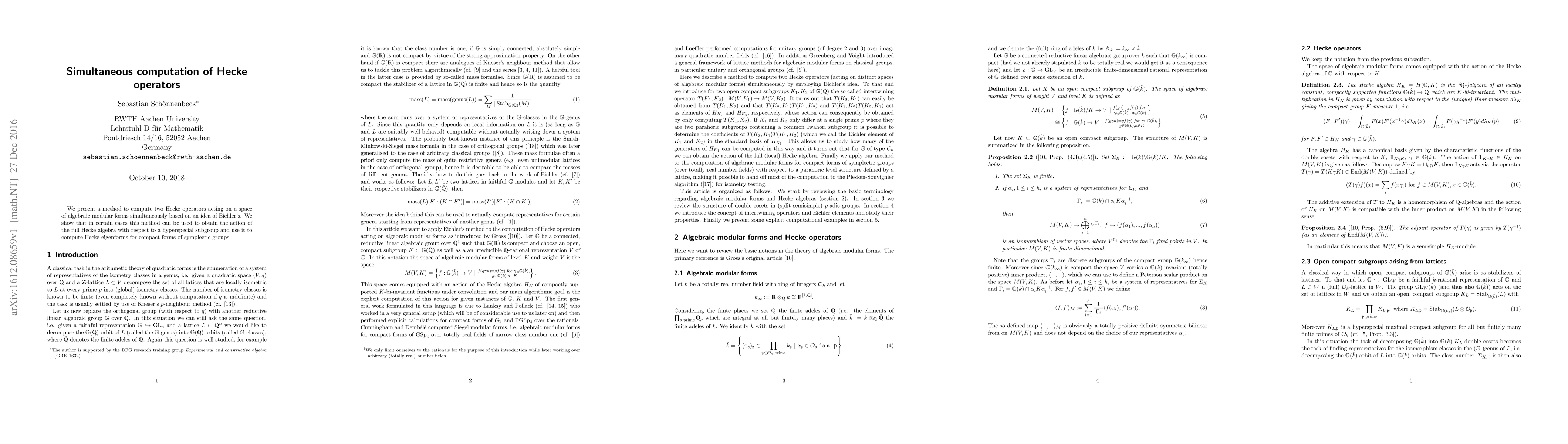 We present a method to compute two Hecke operators acting on a space of algebraic modular forms simultaneously based on an idea of Eichler's. We show that in certain cases this method can be used to obtain the action of the full Hecke algebra with respect to a hyperspecial subgroup and use it to compute Hecke eigenforms for compact forms of symplectic groups.