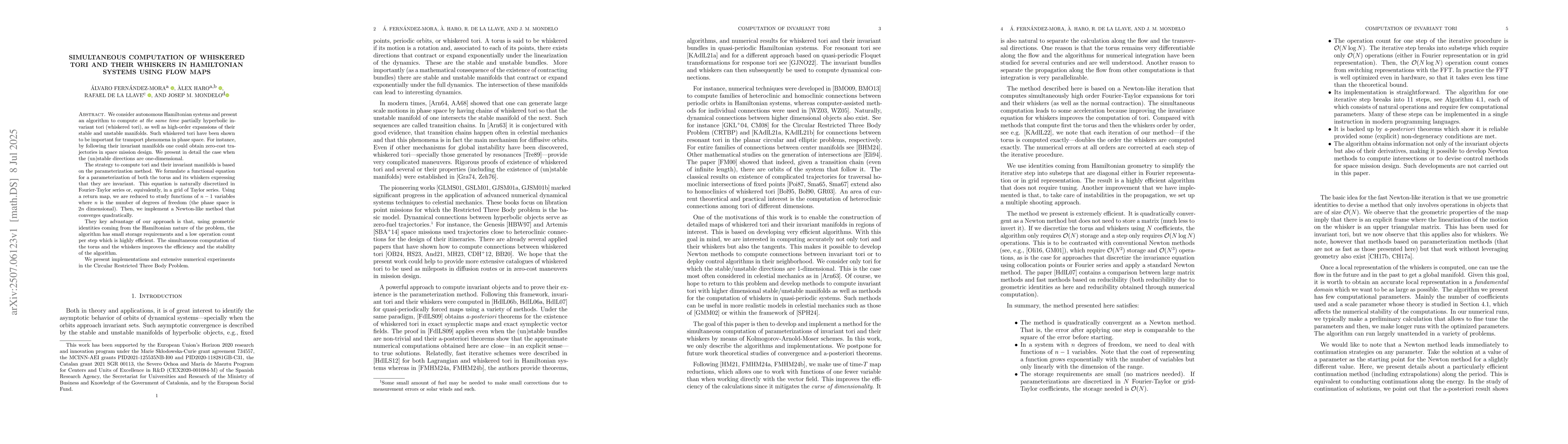 We consider autonomous Hamiltonian systems and present an algorithm to compute at the same time partially hyperbolic invariant tori (whiskered tori), as well as high-order expansions of their stable and unstable manifolds. Such whiskered tori have been shown to be important for transport phenomena in phase space. For instance, by following their invariant manifolds one could obtain zero-cost trajectories in space mission design. We present in detail the case when the (un)stable directions are one-dimensional. The strategy to compute tori and their invariant manifolds is based on the parameterization method. We formulate a functional equation for a parameterization of both the torus and its whiskers expressing that they are invariant. This equation is naturally discretized in Fourier-Taylor series or, equivalently, in a grid of Taylor series. Using a return map, we are reduced to study functions of n - 1 variables where n is the number of degrees of freedom (the phase space is 2n dimensional). Then, we implement a Newton-like method that converges quadratically. They key advantage of our approach is that, using geometric identities coming from the Hamiltonian nature of the problem, the algorithm has small storage requirements and a low operation count per step which is highly efficient. The simultaneous computation of the torus and the whiskers improves the efficiency and the stability of the algorithm. We present implementations and extensive numerical experiments in the Circular Restricted Three Body Problem.