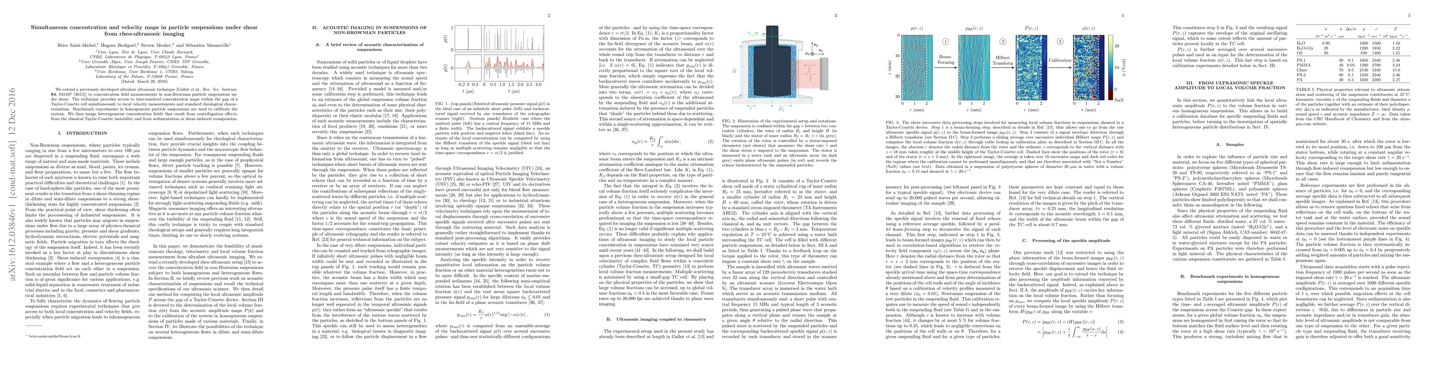 This paper extends an ultrafast ultrasonic technique to measure concentration fields in non-Brownian particle suspensions under shear, providing simultaneous concentration and velocity maps within a Taylor-Couette cell. The method is calibrated using benchmark experiments and applied to image heterogeneous concentration fields due to various physical effects.