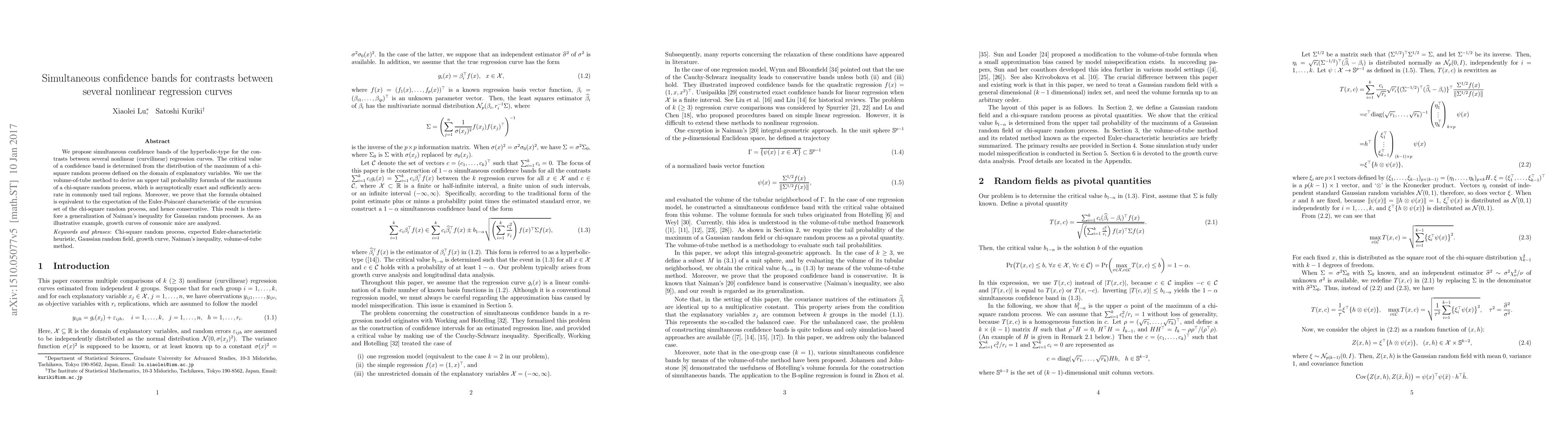 This paper proposes hyperbolic-type simultaneous confidence bands for contrasts between multiple nonlinear regression curves, using the volume-of-tube method to derive an asymptotically exact upper tail probability formula for the maximum of a chi-square random process. The method is shown to be conservative and generalizes Naiman's inequality for Gaussian random processes, demonstrated through an analysis of consomic mice growth curves.