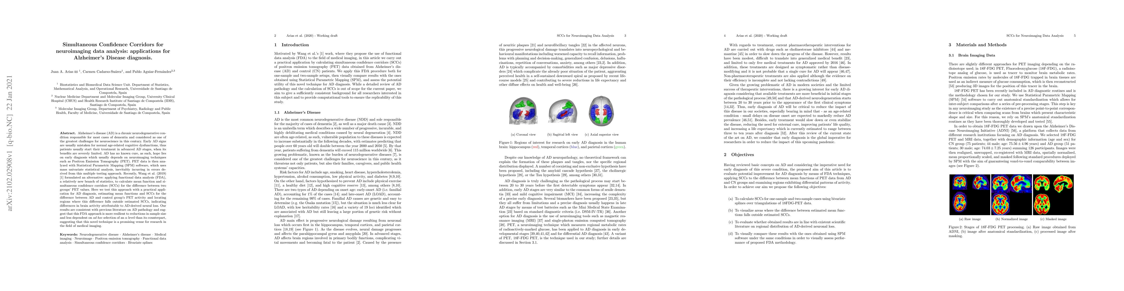 Alzheimer's disease (AD) is a chronic neurodegenerative condition responsible for most cases of dementia and considered as one of the greatest challenges for neuroscience in this century. Early Ad signs are usually mistaken for normal age-related cognitive dysfunctions, thus patients usually start their treatment in advanced AD stages, when its benefits are severely limited. AD has no known cure, as such, hope lies on early diagnosis which usually depends on neuroimaging techniques such as Positron Emission Tomography (PET). PET data is then analyzed with Statistical Parametric Mapping (SPM) software, which uses mass univariate statistical analysis, inevitably incurring in errors derived from this multiple testing approach. Recently, Wang et al. (2020) formulated an alternative: applying functional data analysis (FDA), a relatively new branch of statistics, to calculate mean function and simultaneous confidence corridors (SCCs) for the difference between two groups' PET values. Here we test this approach with a practical application for AD diagnosis, estimating mean functions and SCCs for the difference between AD and control group's PET activity and locating regions where this difference galls outside estimated SCCs, indicating differences in brain activity attributable to AD-derived neural loss. Our results are consistent with previous literature on AD pathology and suggest that this FDA approach is more resilient to reductions in sample size and less dependent on ad hoc selection of an {\alpha} level than its counterpart, suggesting that this novel technique is a promising venue for research in the field of medical imaging.