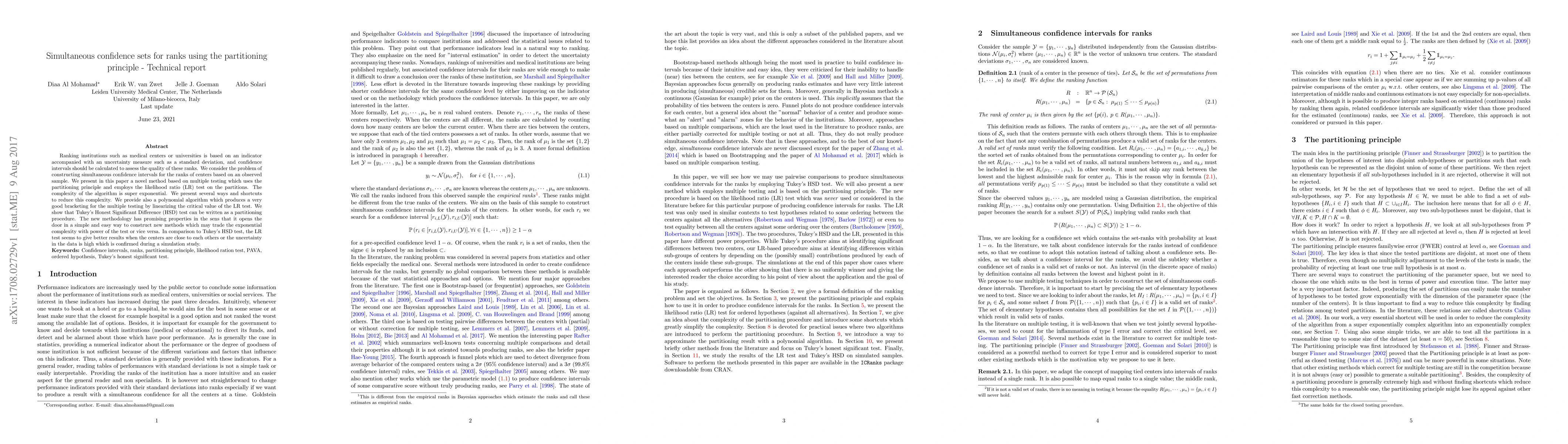 Ranking institutions such as medical centers or universities is based on an indicator accompanied with an uncertainty measure such as a standard deviation, and confidence intervals should be calculated to assess the quality of these ranks. We consider the problem of constructing simultaneous confidence intervals for the ranks of centers based on an observed sample. We present in this paper a novel method based on multiple testing which uses the partitioning principle and employs the likelihood ratio (LR) test on the partitions. The complexity of the algorithm is super exponential. We present several ways and shortcuts to reduce this complexity. We provide also a polynomial algorithm which produces a very good bracketing for the multiple testing by linearizing the critical value of the LR test. We show that Tukey's Honest Significant Difference (HSD) test can be written as a partitioning procedure. The new methodology has promising properties in the sens that it opens the door in a simple and easy way to construct new methods which may trade the exponential complexity with power of the test or vice versa. In comparison to Tukey's HSD test, the LR test seems to give better results when the centers are close to each others or the uncertainty in the data is high which is confirmed during a simulation study.