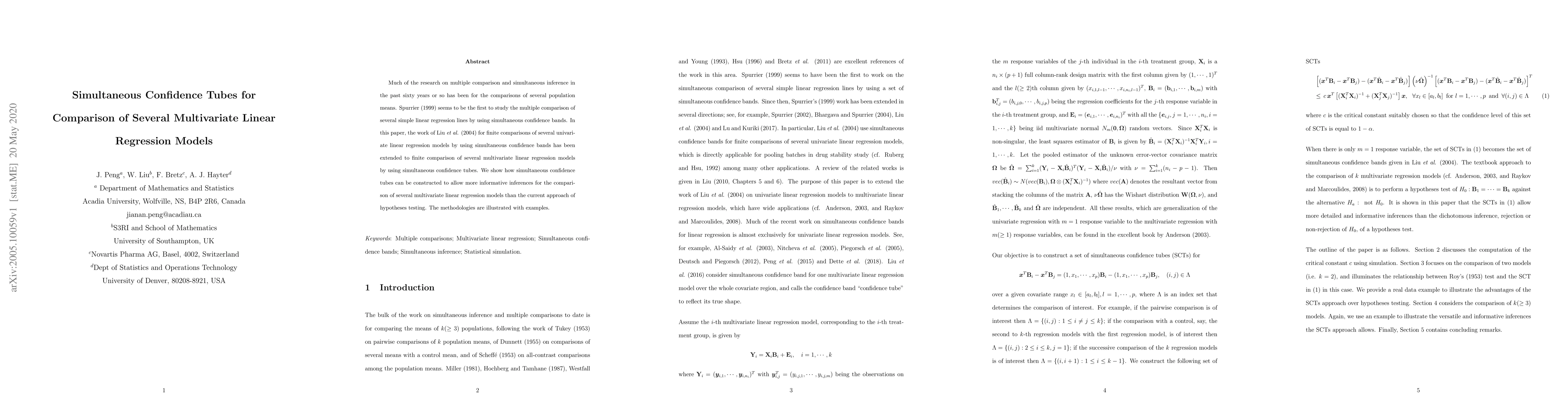 This paper extends the methodology of simultaneous confidence bands for comparing several univariate linear regression models to multivariate linear regression models using simultaneous confidence tubes, providing a more informative inference approach than traditional hypothesis testing. Examples illustrate the practical application of the proposed method.