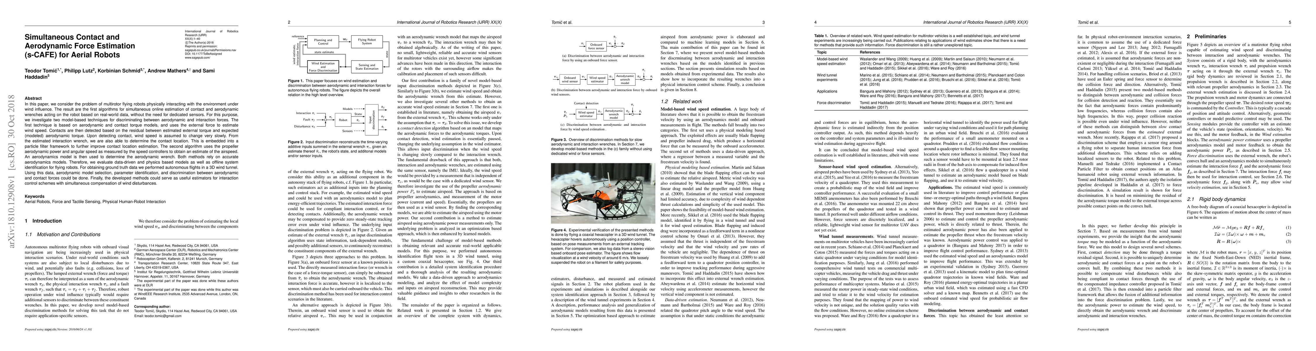 In this paper, we consider the problem of multirotor flying robots physically interacting with the environment under wind influence. The result are the first algorithms for simultaneous online estimation of contact and aerodynamic wrenches acting on the robot based on real-world data, without the need for dedicated sensors. For this purpose, we investigate two model-based techniques for discriminating between aerodynamic and interaction forces. The first technique is based on aerodynamic and contact torque models, and uses the external force to estimate wind speed. Contacts are then detected based on the residual between estimated external torque and expected (modeled) aerodynamic torque. Upon detecting contact, wind speed is assumed to change very slowly. From the estimated interaction wrench, we are also able to determine the contact location. This is embedded into a particle filter framework to further improve contact location estimation. The second algorithm uses the propeller aerodynamic power and angular speed as measured by the speed controllers to obtain an estimate of the airspeed. An aerodynamics model is then used to determine the aerodynamic wrench. Both methods rely on accurate aerodynamics models. Therefore, we evaluate data-driven and physics based models as well as offline system identification for flying robots. For obtaining ground truth data we performed autonomous flights in a 3D wind tunnel. Using this data, aerodynamic model selection, parameter identification, and discrimination between aerodynamic and contact forces could be done. Finally, the developed methods could serve as useful estimators for interaction control schemes with simultaneous compensation of wind disturbances.