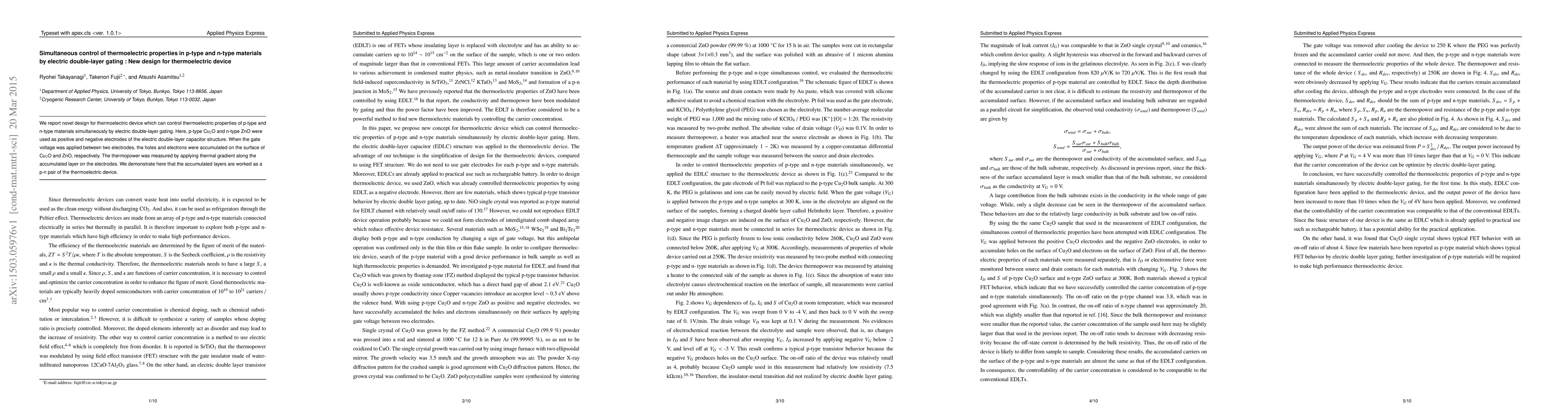 We report novel design for thermoelectric device which can control thermoelectric properties of p-type and n-type materials simultaneously by electric double-layer gating. Here, p-type Cu2O and n-type ZnO were used as positive and negative electrodes of the electric double-layer capacitor structure. When the gate voltage was applied between two electrodes, the holes and electrons were accumulated on the surface of Cu2O and ZnO, respectively. The thermopower was measured by applying thermal gradient along the accumulated layer on the electrodes. We demonstrate here that the accumulated layers are worked as a p-n pair of the thermoelectric device.