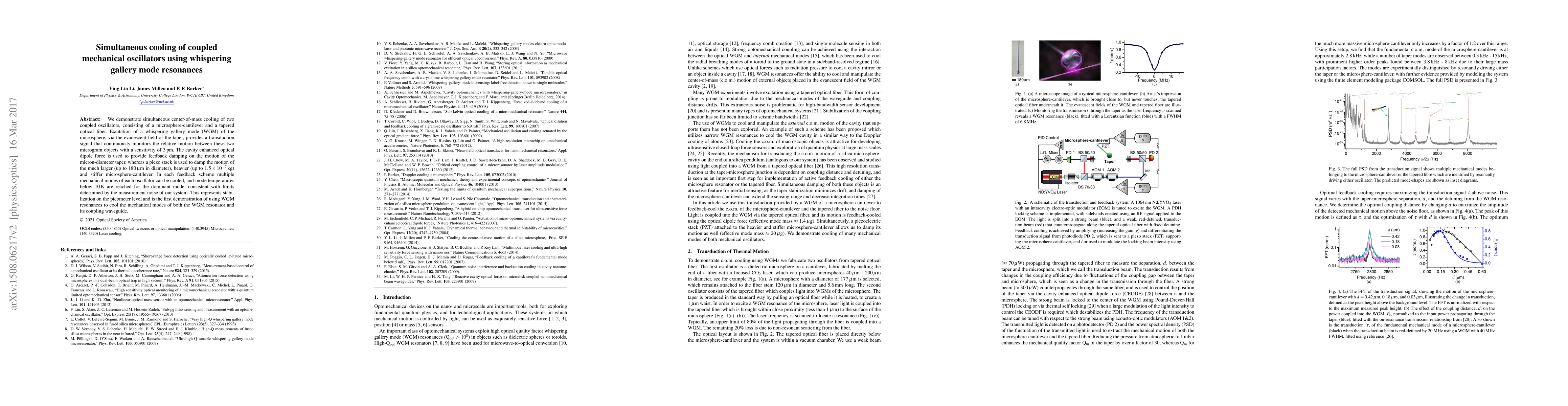 This paper demonstrates the simultaneous cooling of two coupled mechanical oscillators using whispering gallery mode resonances, achieving picometer-level stabilization and cooling multiple mechanical modes to temperatures below 10 K. The method employs cavity-enhanced optical dipole force for feedback damping on a taper and a piezo stack for the larger microsphere-cantilever.