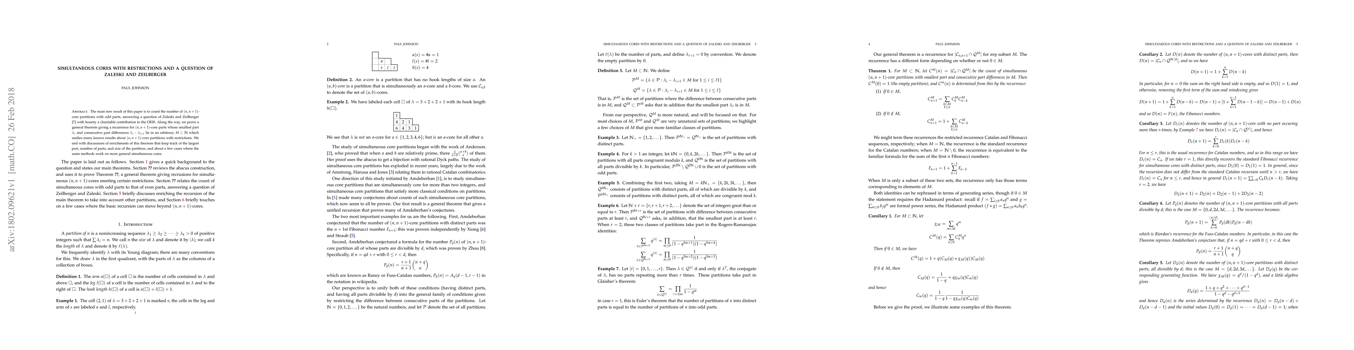 IMPORTANT NOTE: This paper is much rougher than I'd usually submit, and not entirely complete, though the main theorems and proofs should not be hard to follow. Given the ongoing strike at UK Universities it may be some time before I get to complete it to my satisfaction, and in the meantime people I've shared the preliminary draft with would like to be able to reference it. Hence I'm uploading it in its current form, and will update it later. The main new result of this paper is to count the number of (n,n+1)-core partitions with odd parts, answering a question of Zaleski and Zeilberger with bounty a charitable contribution to the OEIS. Along the way, we prove a general theorem giving a recurrence for (n,n+1)-core parts whose smallest part and consecutive part differences are restricted to lie in an arbitrary set M. This theorem unifies many known results about (n,n+1)-core partitions with restrictions. We end with discussions of extensions of the general theorem that keep track of the largest part, number of parts, and size of the partition, and about a few cases where the same methods work on more general simultaneous cores.
