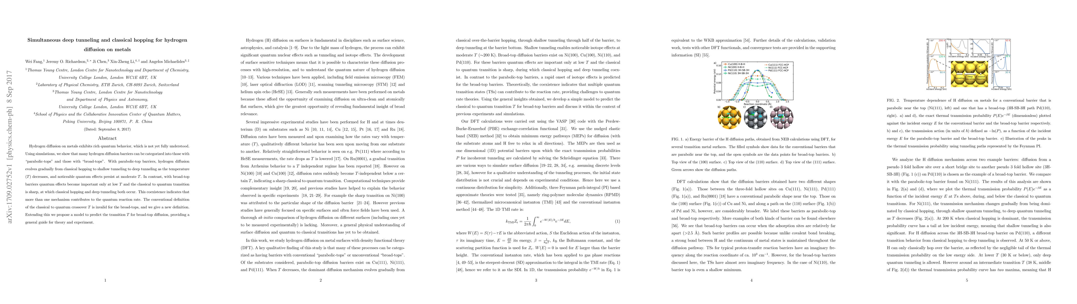 This paper explores hydrogen diffusion on metals, revealing two types of barriers: parabolic-tops and broad-tops. For parabolic-tops, hydrogen diffusion transitions from classical hopping to deep tunneling with temperature, showing persistent quantum effects at moderate temperatures. In contrast, broad-tops exhibit a sharp classical to quantum transition at low temperatures where both classical hopping and deep tunneling occur, invalidating conventional crossover definitions and prompting a new model for predicting transition temperatures.