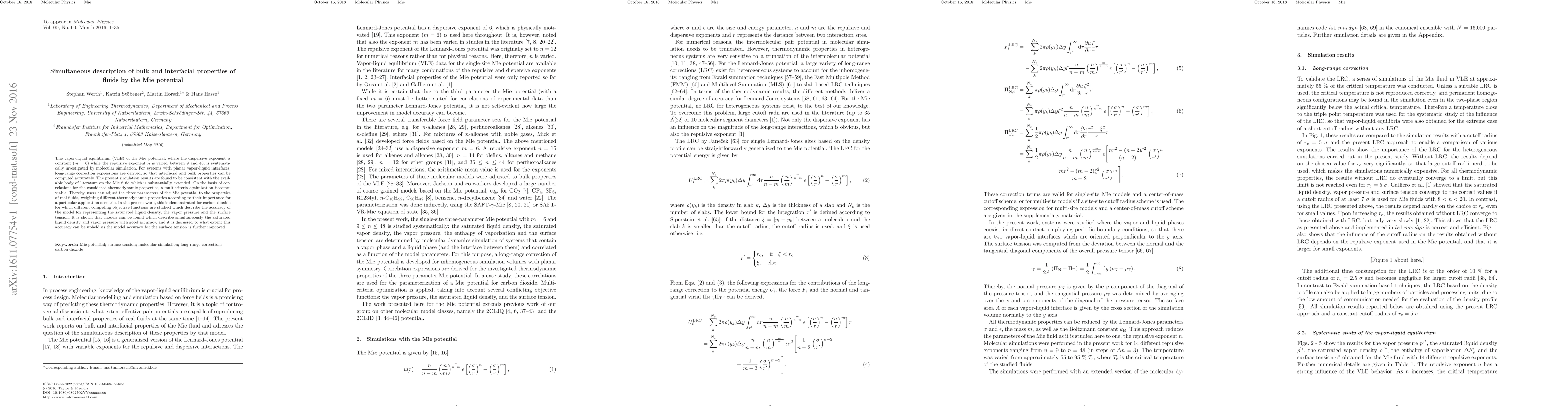 This paper explores the vapor-liquid equilibrium of the Mie potential through molecular simulations, deriving long-range correction expressions for accurate computation of both bulk and interfacial properties. It demonstrates multicriteria optimization to adjust the Mie potential parameters for real fluids, exemplified by carbon dioxide, showing good accuracy in representing liquid density and vapor pressure, while discussing the trade-offs in surface tension accuracy.