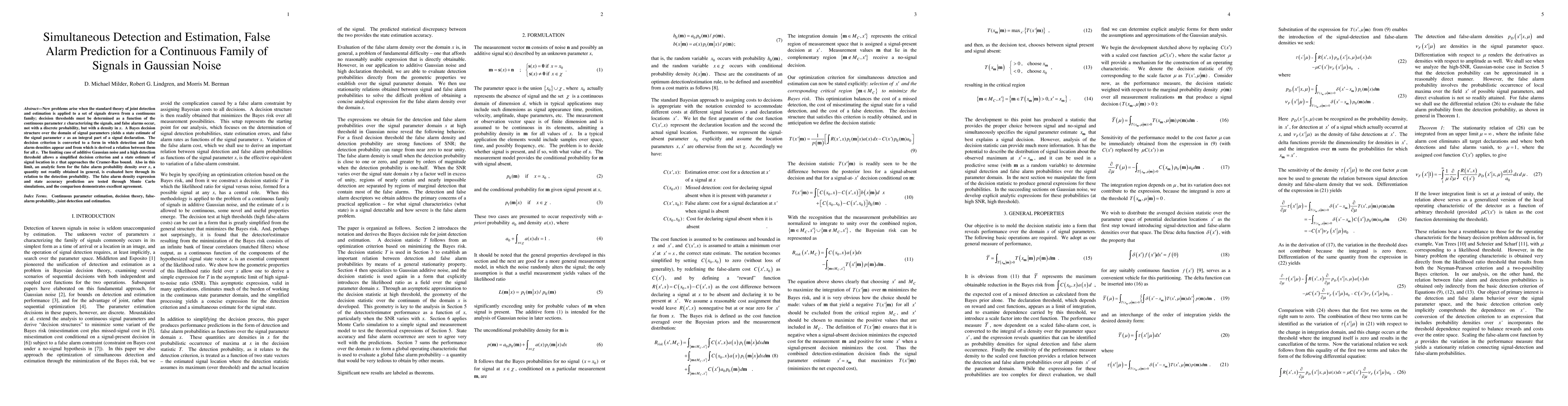 This paper develops a new framework for simultaneous detection and estimation of signals from a continuous family in Gaussian noise, addressing the challenge of false alarm prediction. It derives a Bayes decision structure and a simplified detection criterion under high thresholds, providing an analytic form for the false alarm density and demonstrating its accuracy via Monte Carlo simulations.