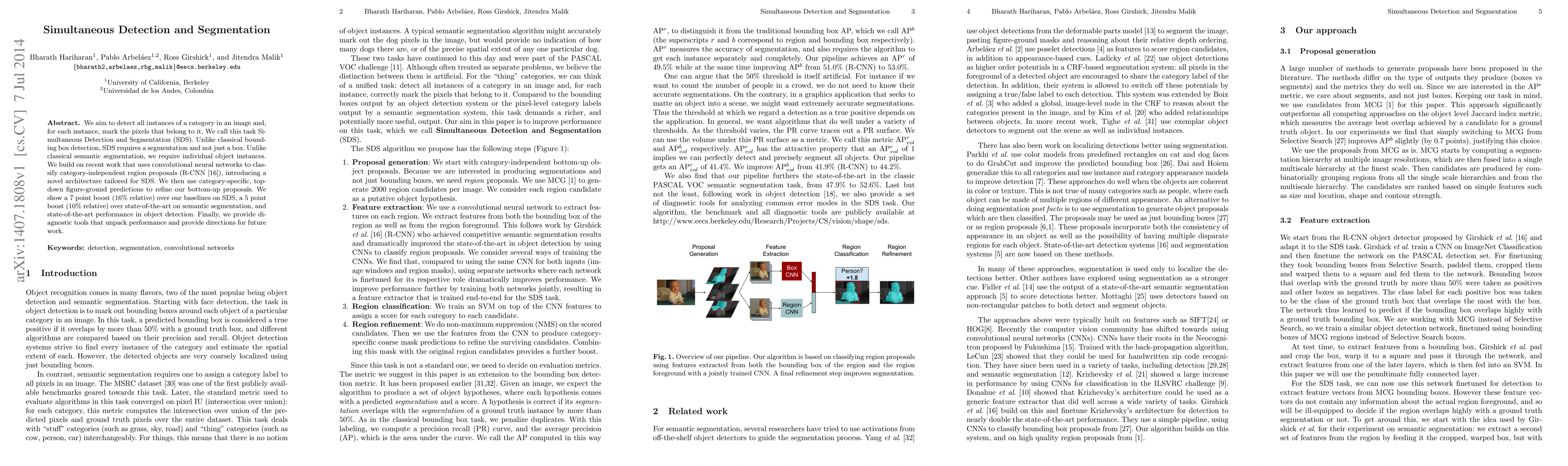 We aim to detect all instances of a category in an image and, for each instance, mark the pixels that belong to it. We call this task Simultaneous Detection and Segmentation (SDS). Unlike classical bounding box detection, SDS requires a segmentation and not just a box. Unlike classical semantic segmentation, we require individual object instances. We build on recent work that uses convolutional neural networks to classify category-independent region proposals (R-CNN [16]), introducing a novel architecture tailored for SDS. We then use category-specific, top- down figure-ground predictions to refine our bottom-up proposals. We show a 7 point boost (16% relative) over our baselines on SDS, a 5 point boost (10% relative) over state-of-the-art on semantic segmentation, and state-of-the-art performance in object detection. Finally, we provide diagnostic tools that unpack performance and provide directions for future work.