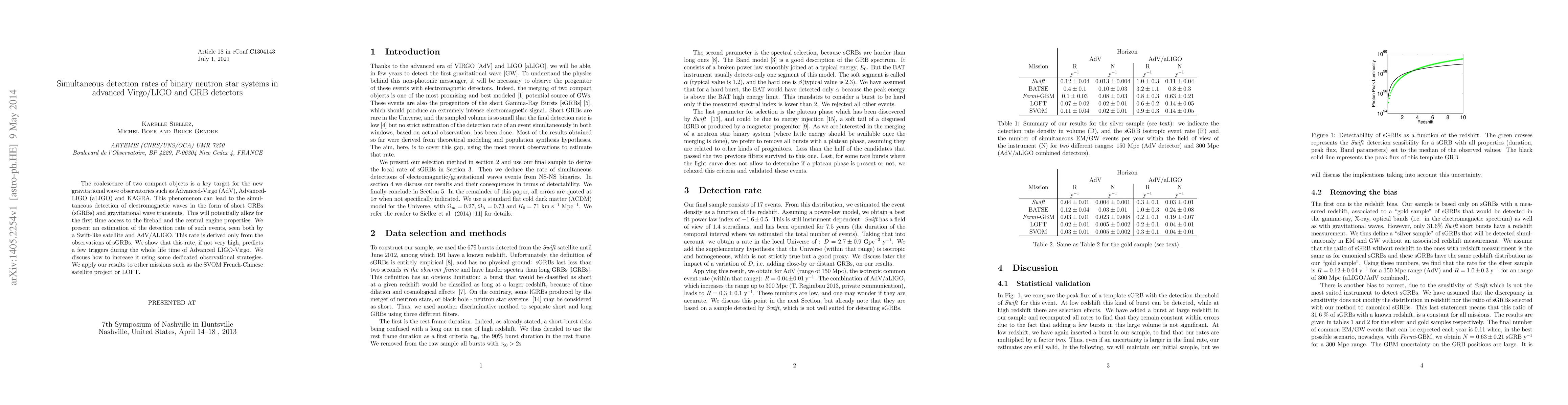 This paper estimates the simultaneous detection rates of binary neutron star mergers by Advanced Virgo/LIGO and short GRB detectors, predicting few triggers during the operational lifetime of Advanced LIGO-Virgo. It proposes strategies to enhance detection rates and applies findings to future missions like SVOM and LOFT.