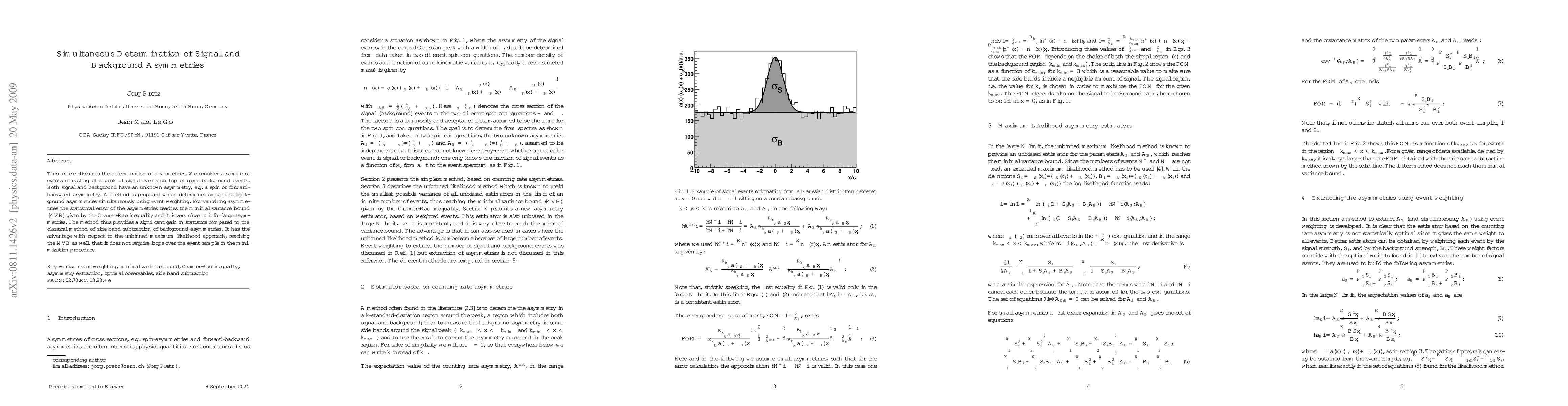 This article discusses the determination of asymmetries. We consider a sample of events consisting of a peak of signal events on top of some background events. Both signal and background have an unknown asymmetry, e.g. a spin or forward-backward asymmetry. A method is proposed which determines signal and background asymmetries simultaneously using event weighting. For vanishing asymmetries the statistical error of the asymmetries reaches the minimal variance bound (MVB) given by the Cram\'er-Rao inequality and it is very close to it for large asymmetries. The method thus provides a significant gain in statistics compared to the classical method of side band subtraction of background asymmetries. It has the advantage with respect to the unbinned maximum likelihood approach, reaching the MVB as well, that it does not require loops over the event sample in the minimization procedure.