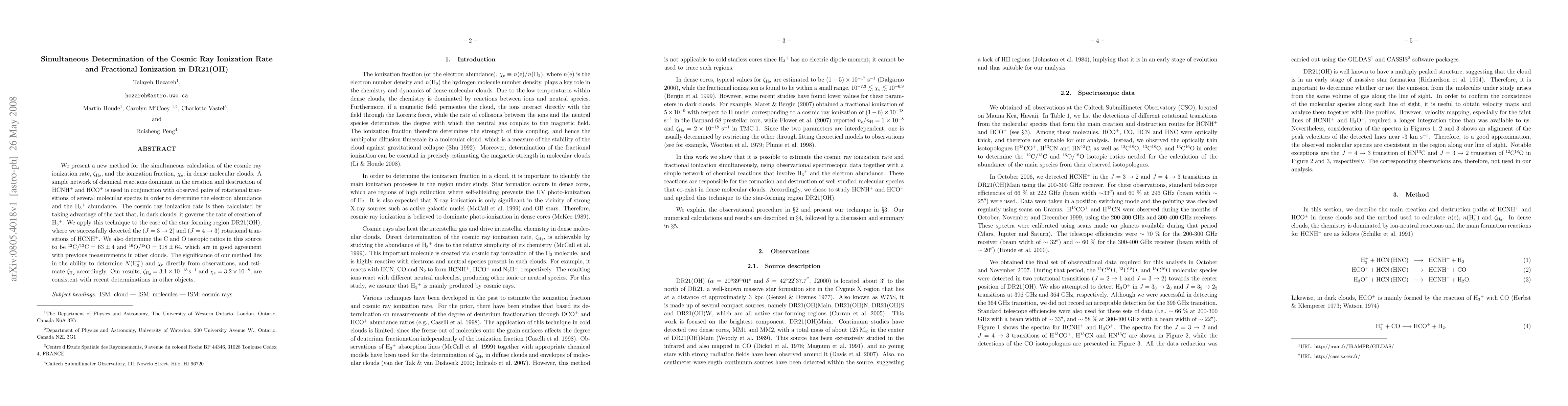 We present a new method for the simultaneous calculation of the cosmic ray ionization rate, zeta(H2), and the ionization fraction, chi(e), in dense molecular clouds. A simple network of chemical reactions dominant in the creation and destruction of HCNH+ and HCO+ is used in conjunction with observed pairs of rotational transitions of several molecular species in order to determine the electron abundance and the H3+ abundance. The cosmic ray ionization rate is then calculated by taking advantage of the fact that, in dark clouds, it governs the rate of creation of H3+. We apply this technique to the case of the star-forming region DR21(OH), where we successfully detected the (J=3-2) and (J=4-3) rotational transitions of HCNH+. We also determine the C and O isotopic ratios in this source to be 12C/13C=63+-4 and 16O/18O=318+-64, which are in good agreement with previous measurements in other clouds. The significance of our method lies in the ability to determine N(H3+) and chi(e) directly from observations, and estimate zeta(H2) accordingly. Our results, zeta(H2)=3.1x10^(-18) 1/s and chi(e)=3.2x10^(-8), are consistent with recent determinations in other objects.