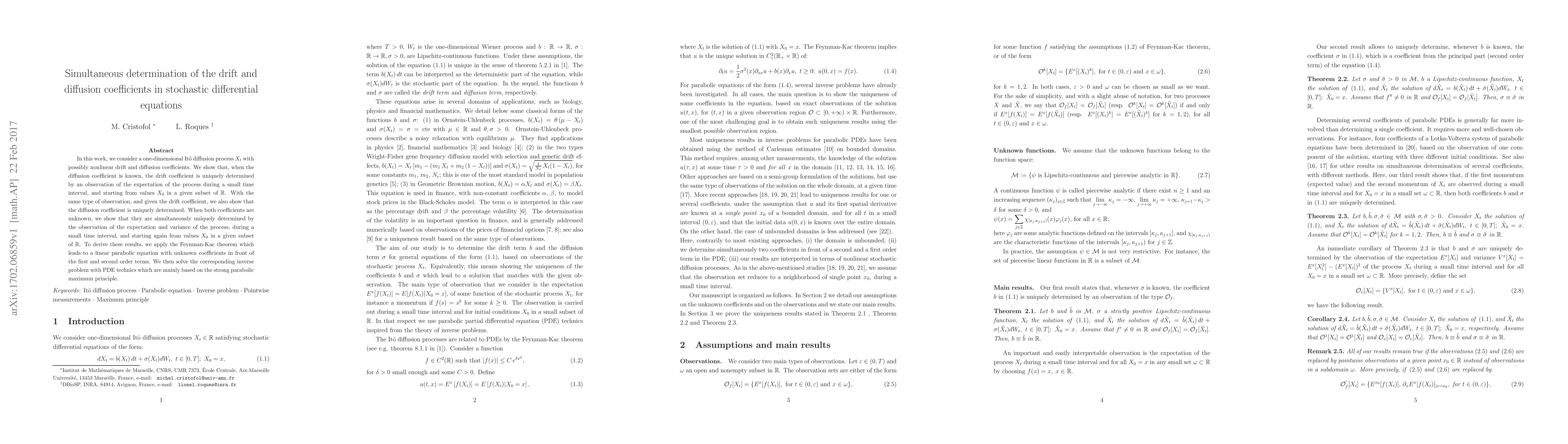 Researchers developed a method to uniquely determine both drift and diffusion coefficients in stochastic differential equations based on observations of expectation and variance over small time intervals.