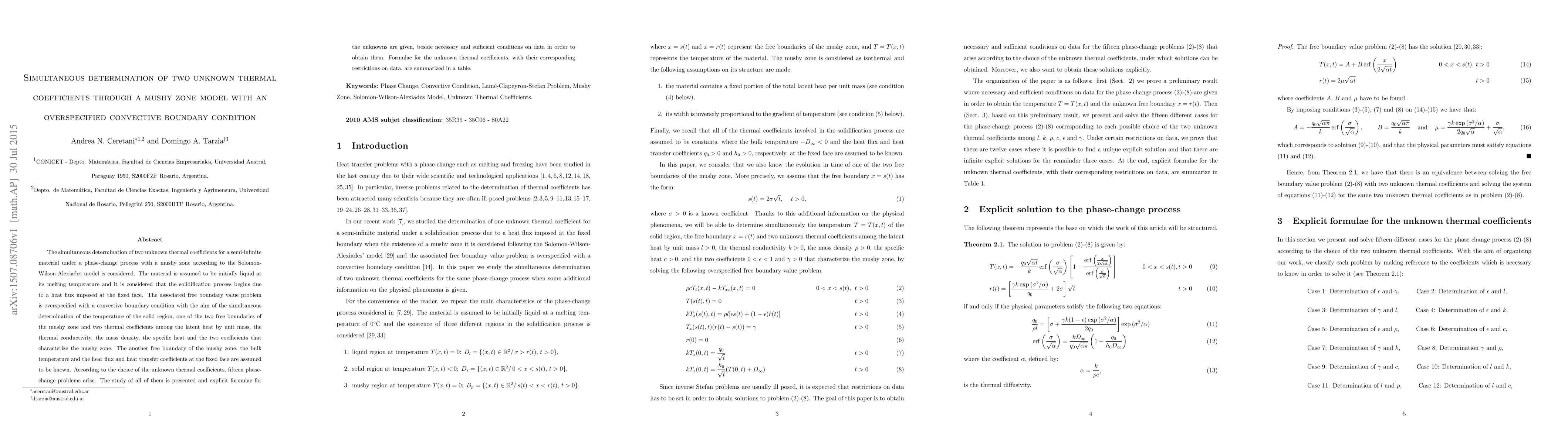 This paper investigates the simultaneous determination of two unknown thermal coefficients for a semi-infinite material undergoing solidification with a mushy zone, using the Solomon-Wilson-Alexiades model. An overspecified convective boundary condition is employed to solve the associated free boundary value problem, providing explicit formulae and conditions for the unknown thermal coefficients.