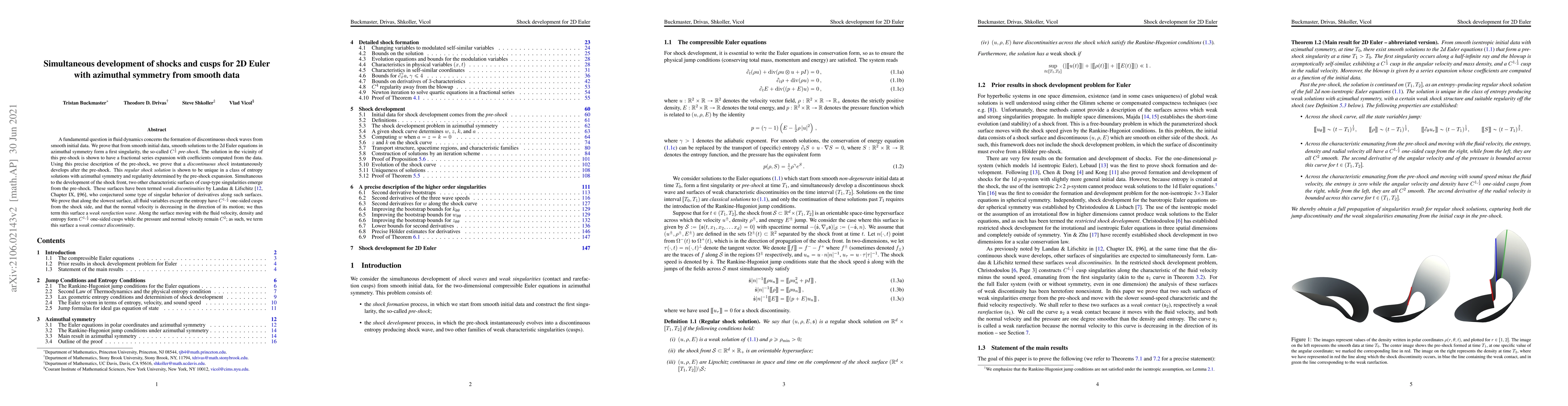 A fundamental question in fluid dynamics concerns the formation of discontinuous shock waves from smooth initial data. We prove that from smooth initial data, smooth solutions to the 2d Euler equations in azimuthal symmetry form a first singularity, the so-called $C^{\frac{1}{3}} $ pre-shock. The solution in the vicinity of this pre-shock is shown to have a fractional series expansion with coefficients computed from the data. Using this precise description of the pre-shock, we prove that a discontinuous shock instantaneously develops after the pre-shock. This regular shock solution is shown to be unique in a class of entropy solutions with azimuthal symmetry and regularity determined by the pre-shock expansion. Simultaneous to the development of the shock front, two other characteristic surfaces of cusp-type singularities emerge from the pre-shock. These surfaces have been termed weak discontinuities by Landau & Lifschitz [Chapter IX, \S 96], who conjectured some type of singular behavior of derivatives along such surfaces. We prove that along the slowest surface, all fluid variables except the entropy have $C^{1, {\frac{1}{2}} }$ one-sided cusps from the shock side, and that the normal velocity is decreasing in the direction of its motion; we thus term this surface a weak rarefaction wave. Along the surface moving with the fluid velocity, density and entropy form $C^{1, {\frac{1}{2}} }$ one-sided cusps while the pressure and normal velocity remain $C^2$; as such, we term this surface a weak contact discontinuity.