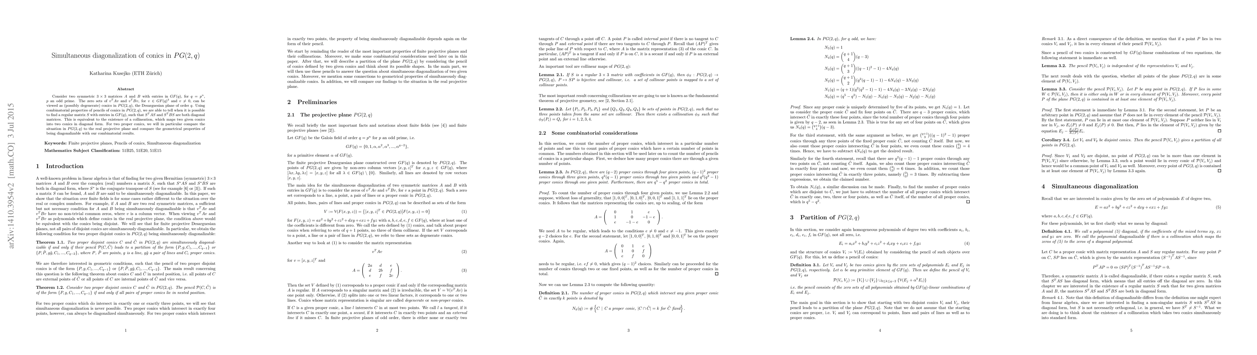 This research investigates the conditions under which two symmetric matrices representing conics in the finite projective plane $PG(2,q)$ can be simultaneously diagonalized by a nonsingular matrix. It highlights differences between diagonalization possibilities in $PG(2,q)$ and the real projective plane.