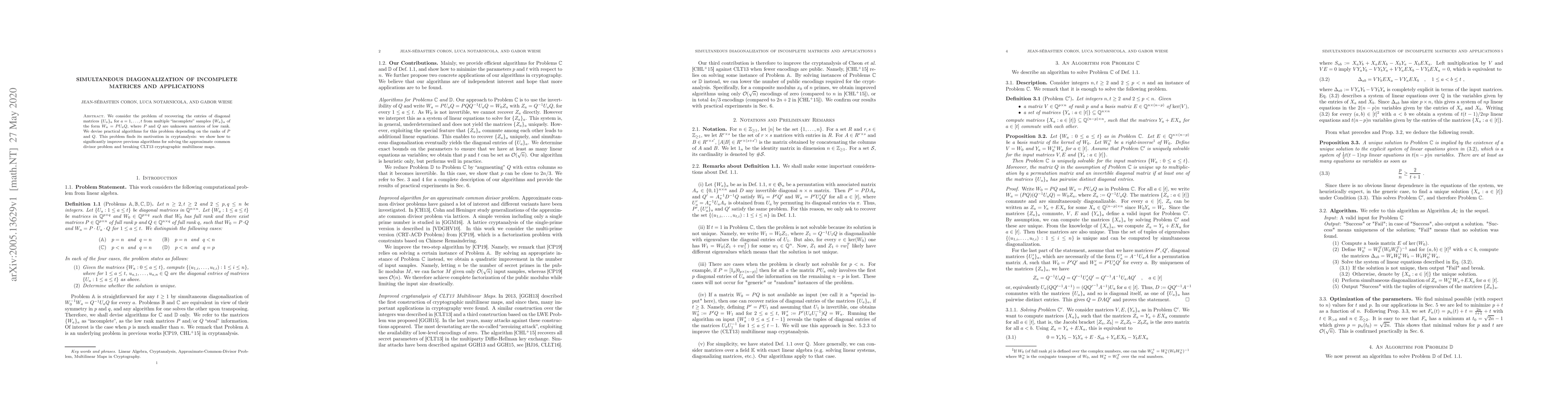 We consider the problem of recovering the entries of diagonal matrices $\{U_a\}_a$ for $a = 1,\ldots,t$ from multiple "incomplete" samples $\{W_a\}_a$ of the form $W_a=PU_aQ$, where $P$ and $Q$ are unknown matrices of low rank. We devise practical algorithms for this problem depending on the ranks of $P$ and $Q$. This problem finds its motivation in cryptanalysis: we show how to significantly improve previous algorithms for solving the approximate common divisor problem and breaking CLT13 cryptographic multilinear maps.