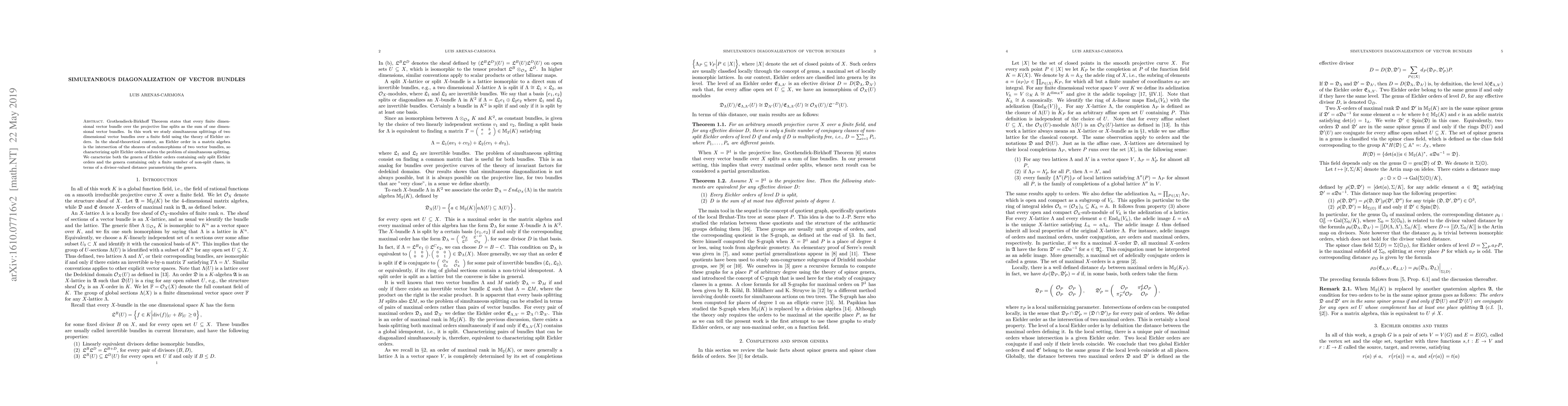 Grothendieck-Birkhoff Theorem states that every finite dimensional vector bundle over the projective line splits as the sum of one dimensional vector bundles. In this work we study simultaneous splittings of two dimensional vector bundles over a finite field using the theory of Eichler orders. In the sheaf-theoretical context, an Eichler order in a matrix algebra is the intersection of the sheaves of endomorphisms of two vector bundles, so characterizing split Eichler orders solves the problem of simultaneous splitting. We caracterize both the genera of Eichler orders containing only split Eichler orders and the genera containing only a finite number of non-split classes, in terms of a divisor-valued distance parametrizing the genera. This article shall not be published in its present form. These results will be included in the article "On genera containing non-split Eichler orders over function fields" [arXiv:1905.08244].