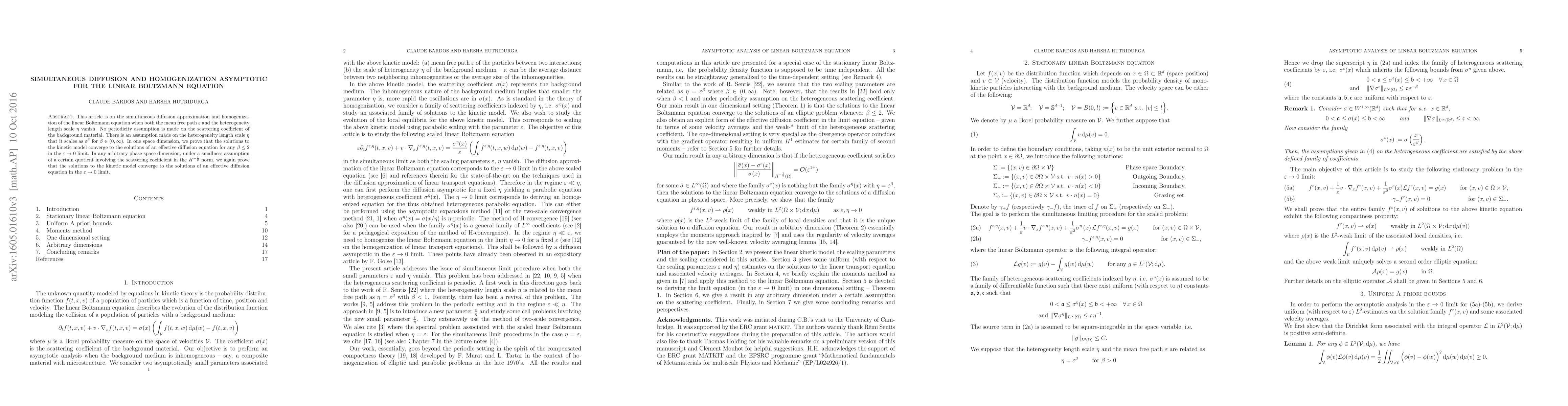 This paper investigates the simultaneous diffusion approximation and homogenization of the linear Boltzmann equation as both the mean free path and heterogeneity length scale vanish. The authors prove convergence to an effective diffusion equation in one space dimension for $\beta \leq 2$ and in arbitrary dimensions under a smallness assumption on the scattering coefficient.