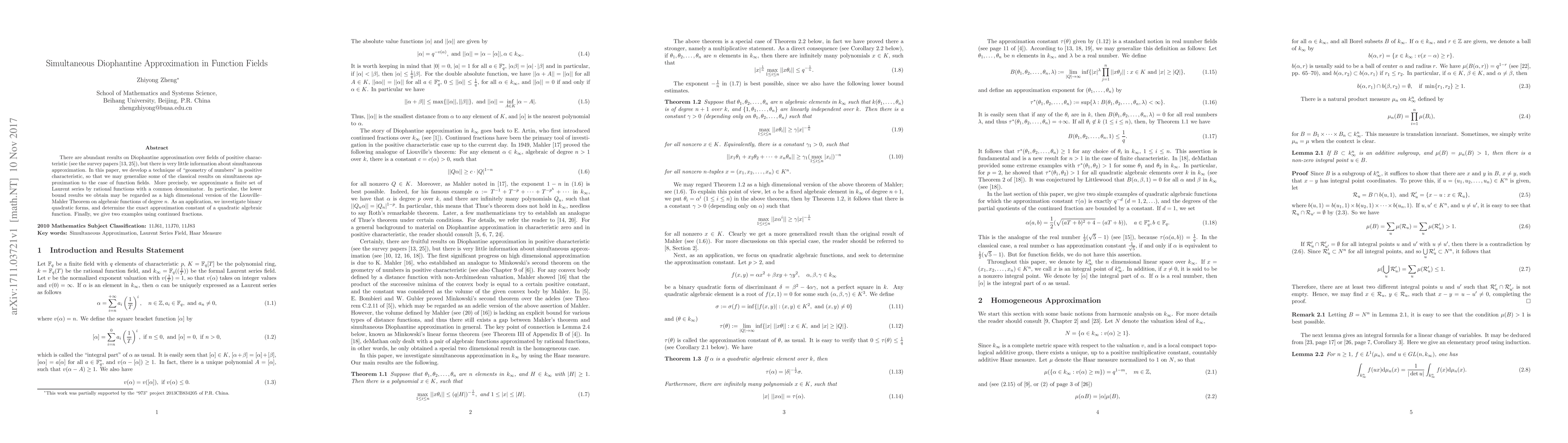 There are abundant results on Diophantine approximation over fields of positive characteristic (see the survey papers [13, 25]), but there is very little information about simultaneous approximation. In this paper, we develop a technique of \geometry of numbers" in positive characteristic, so that we may generalize some of the classical results on simultaneous approximation to the case of function fields. More precisely, we approximate a finite set of Laurent series by rational functions with a common denominator. In particular, the lower bound results we obtain may be regarded as a high dimensional version of the Liouville{ Mahler Theorem on algebraic functions of degree n. As an application, we investigate binary quadratic forms, and determine the exact approximation constant of a quadratic algebraic function. Finally, we give two examples using continued fractions.