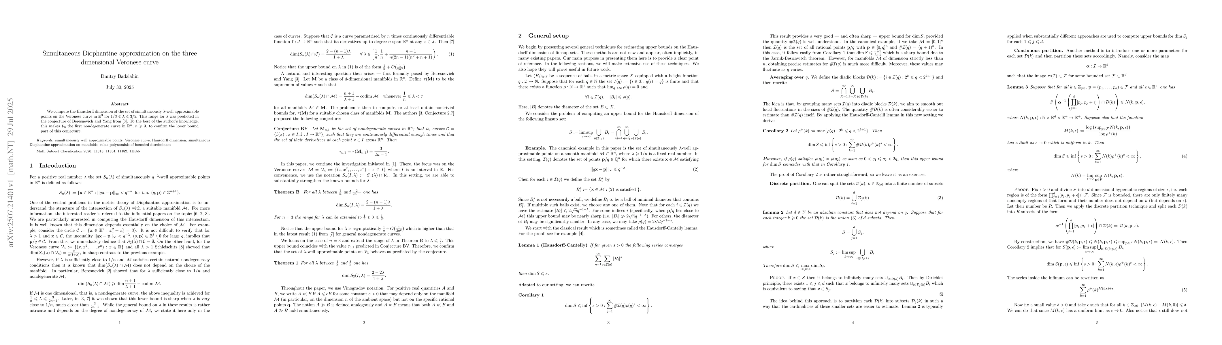 The paper employs a combination of algebraic geometry techniques and Diophantine approximation methods to compute the Hausdorff dimension of the set of simultaneously λ-well approximable points on the Veronese curve in ℝ³ for 1/3 ≤ λ ≤ 3/5.