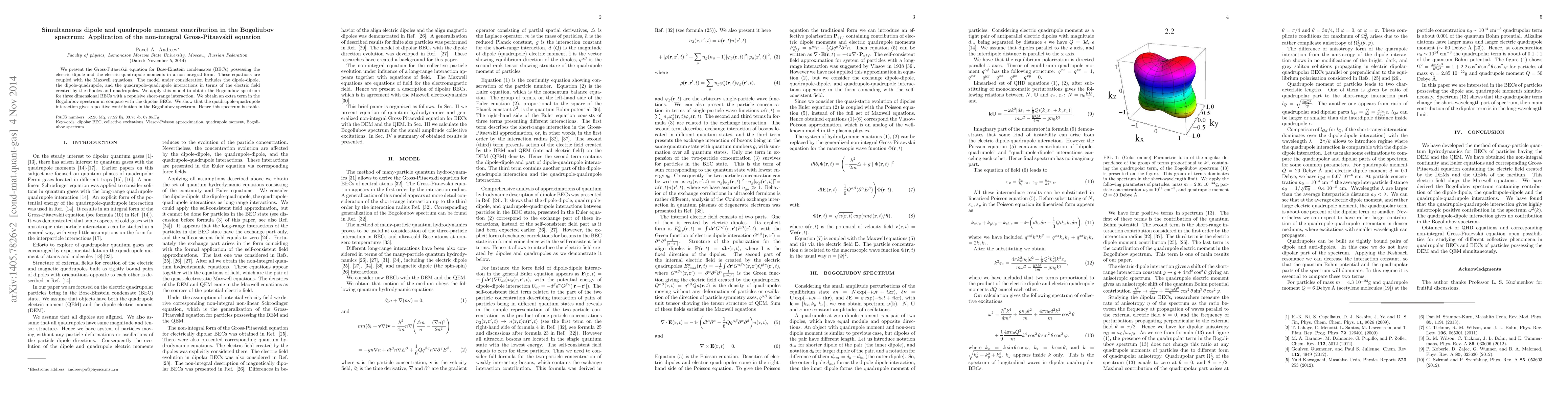 This paper presents a non-integral Gross-Pitaevskii equation for Bose-Einstein condensates with electric dipole and quadrupole moments, coupled with Maxwell equations to account for various interactions. The study reveals an additional term in the Bogoliubov spectrum due to quadrupole-quadrupole interactions, ensuring the stability of the spectrum.