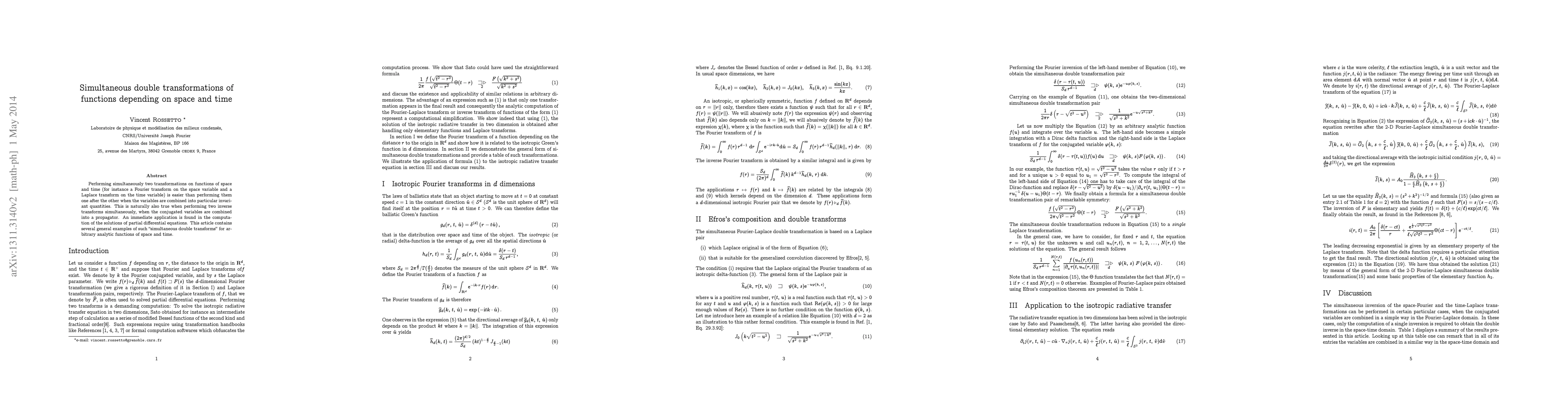 It is shown that performing simultaneously two transformations on functions of space and time (for instance a Fourier transform on the space variable and a Laplace transform on the time variable) can be easier than performing them one after the other when the variables are combined in invariant quantities. This is naturally also true when performing two inverse transforms simultaneously, when the conjugated variables are combined into a propagator. An immediate application is found in the computation of the solutions of partial differential equations. This article contains several general examples of such "simultaneous double transforms" for arbitrary analytic functions of space and time.