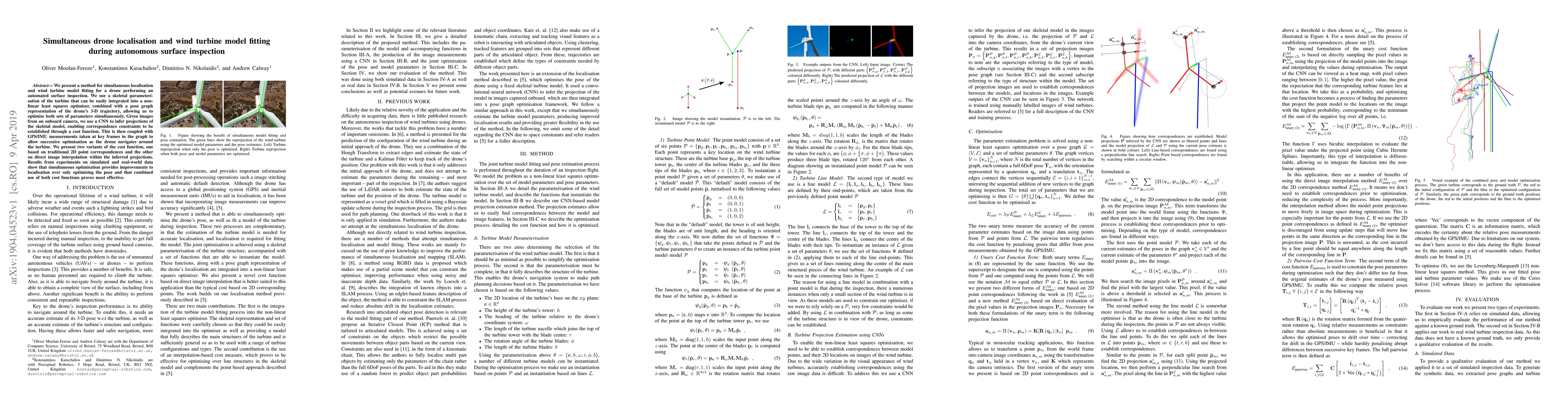 This paper proposes a method for a drone to simultaneously localise itself and fit a wind turbine model during autonomous surface inspection, using a CNN for image-based model projections and a non-linear least squares optimiser for simultaneous parameter optimisation. Experiments show that this approach improves localisation accuracy compared to separate optimisation and that combining two cost functions yields the best results.