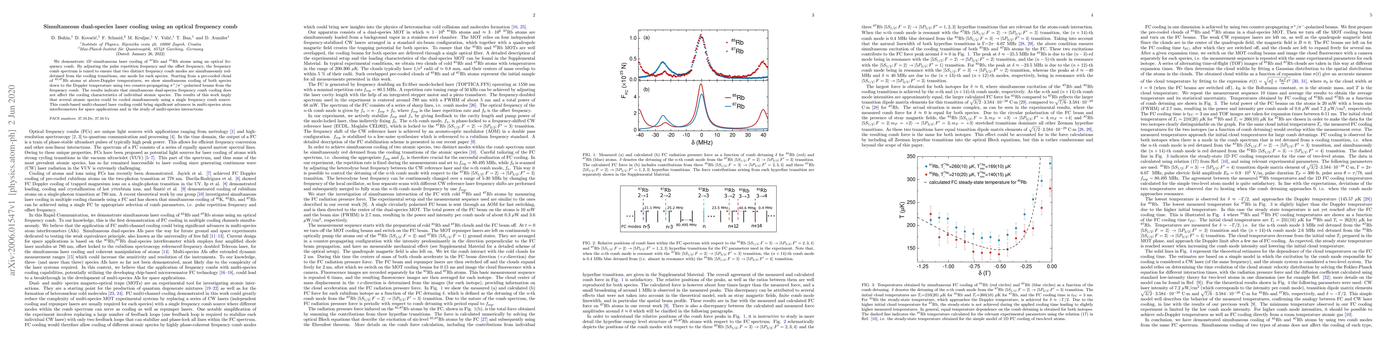 This paper demonstrates simultaneous laser cooling of $^{87}$Rb and $^{85}$Rb atoms using an optical frequency comb, showing that dual-species cooling does not affect individual species' cooling characteristics. This technique could advance multi-species atom interferometers and studies of multi-species interactions.