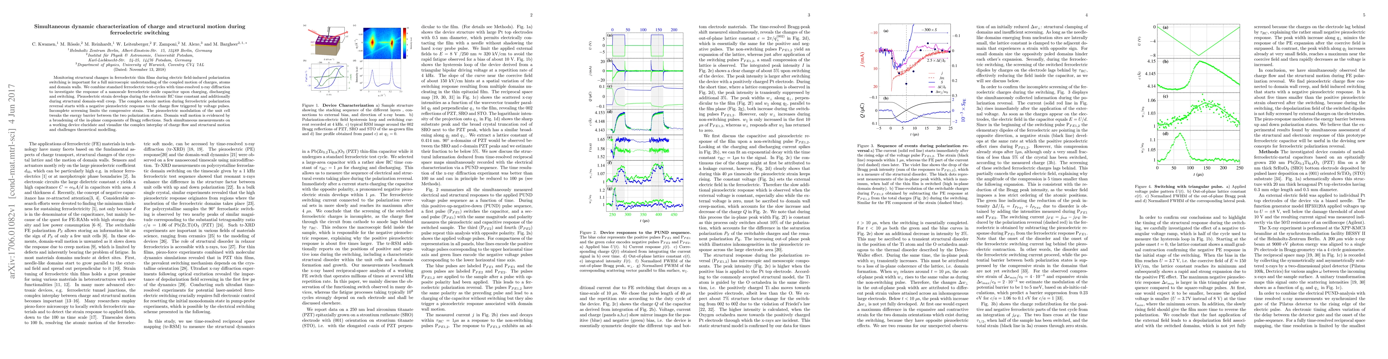 This paper investigates the dynamic coupling between charge flow and structural motion during ferroelectric switching in thin films using time-resolved x-ray diffraction. It reveals that piezoelectric strain develops both during electronic charge flow and structural domain-wall movement, highlighting the intricate interplay between charge and atomic motion during polarization reversal.