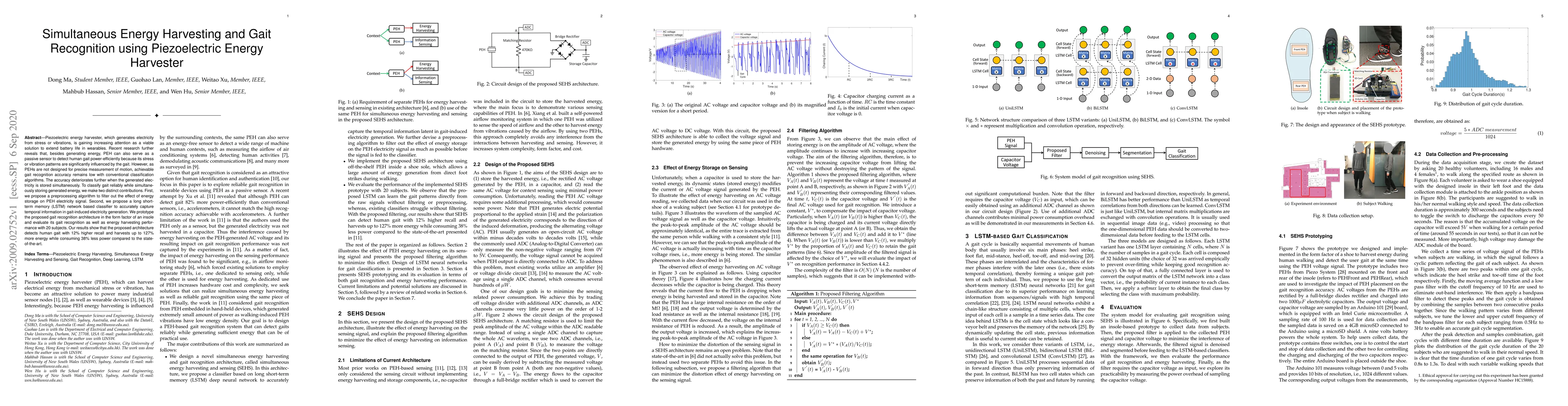 Piezoelectric energy harvester, which generates electricity from stress or vibrations, is gaining increasing attention as a viable solution to extend battery life in wearables. Recent research further reveals that, besides generating energy, PEH can also serve as a passive sensor to detect human gait power-efficiently because its stress or vibration patterns are significantly influenced by the gait. However, as PEHs are not designed for precise measurement of motion, achievable gait recognition accuracy remains low with conventional classification algorithms. The accuracy deteriorates further when the generated electricity is stored simultaneously. To classify gait reliably while simultaneously storing generated energy, we make two distinct contributions. First, we propose a preprocessing algorithm to filter out the effect of energy storage on PEH electricity signal. Second, we propose a long short-term memory (LSTM) network-based classifier to accurately capture temporal information in gait-induced electricity generation. We prototype the proposed gait recognition architecture in the form factor of an insole and evaluate its gait recognition as well as energy harvesting performance with 20 subjects. Our results show that the proposed architecture detects human gait with 12% higher recall and harvests up to 127% more energy while consuming 38% less power compared to the state-of-the-art.
