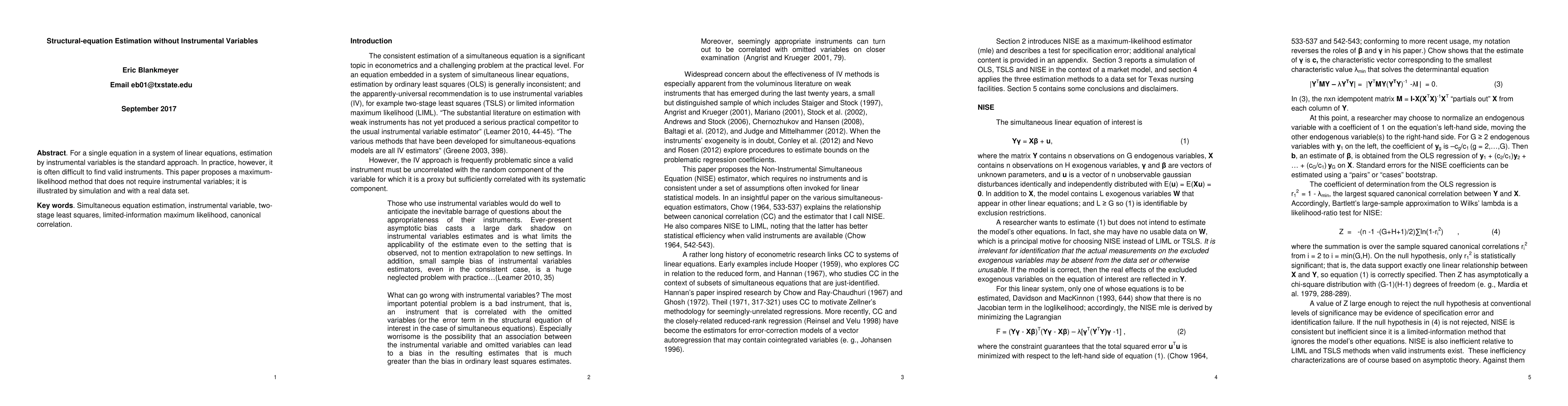 For a single equation in a system of linear equations, estimation by instrumental variables is the standard approach. In practice, however, it is often difficult to find valid instruments. This paper proposes a maximum likelihood method that does not require instrumental variables; it is illustrated by simulation and with a real data set.