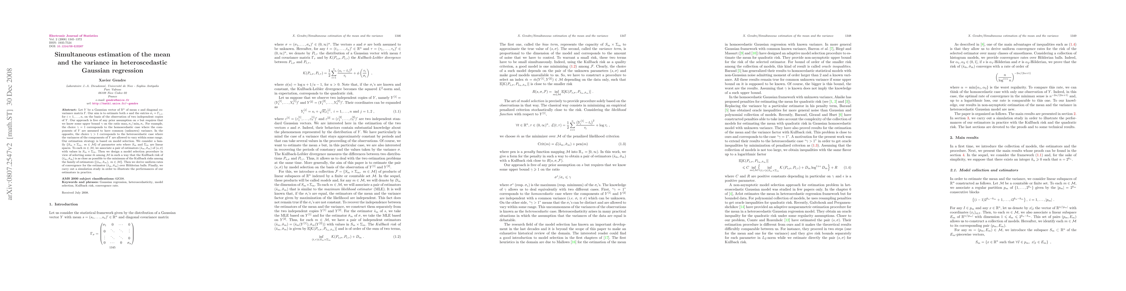 Let $Y$ be a Gaussian vector of $\mathbb{R}^n$ of mean $s$ and diagonal covariance matrix $\Gamma$. Our aim is to estimate both $s$ and the entries $\sigma_i=\Gamma_{i,i}$, for $i=1,...,n$, on the basis of the observation of two independent copies of $Y$. Our approach is free of any prior assumption on $s$ but requires that we know some upper bound $\gamma$ on the ratio $\max_i\sigma_i/\min_i\sigma_i$. For example, the choice $\gamma=1$ corresponds to the homoscedastic case where the components of $Y$ are assumed to have common (unknown) variance. In the opposite, the choice $\gamma>1$ corresponds to the heteroscedastic case where the variances of the components of $Y$ are allowed to vary within some range. Our estimation strategy is based on model selection. We consider a family $\{S_m\times\Sigma_m, m\in\mathcal{M}\}$ of parameter sets where $S_m$ and $\Sigma_m$ are linear spaces. To each $m\in\mathcal{M}$, we associate a pair of estimators $(\hat{s}_m,\hat{\sigma}_m)$ of $(s,\sigma)$ with values in $S_m\times\Sigma_m$. Then we design a model selection procedure in view of selecting some $\hat{m}$ among $\mathcal{M}$ in such a way that the Kullback risk of $(\hat{s}_{\hat{m}},\hat{\sigma}_{\hat{m}})$ is as close as possible to the minimum of the Kullback risks among the family of estimators $\{(\hat{s}_m,\hat{\sigma}_m), m\in\mathcal{M}\}$. Then we derive uniform rates of convergence for the estimator $(\hat{s}_{\hat{m}},\hat{\sigma}_{\hat{m}})$ over H\"{o}lderian balls. Finally, we carry out a simulation study in order to illustrate the performances of our estimators in practice.