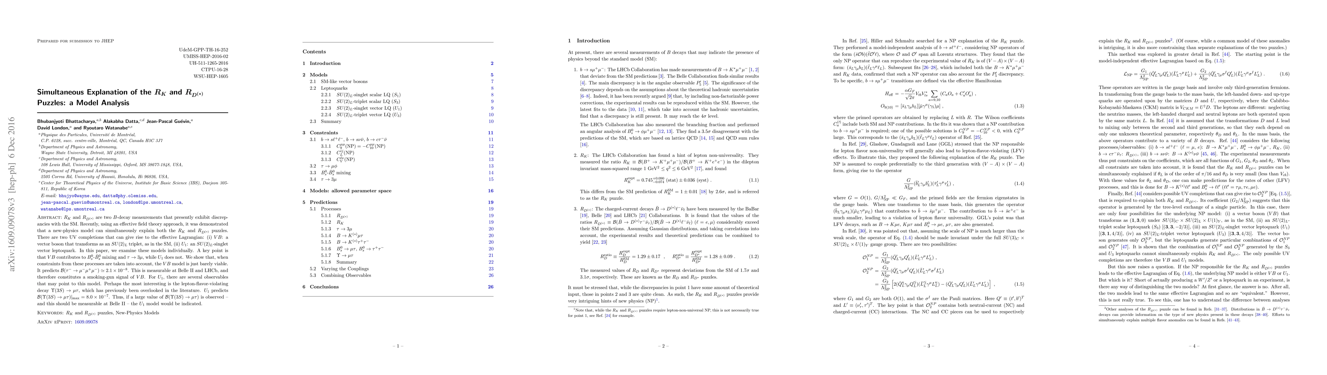 $R_K$ and $R_{D^{(*)}}$ are two $B$-decay measurements that presently exhibit discrepancies with the SM. Recently, using an effective field theory approach, it was demonstrated that a new-physics model can simultaneously explain both the $R_K$ and $R_{D^{(*)}}$ puzzles. There are two UV completions that can give rise to the effective Lagrangian: (i) $VB$: a vector boson that transforms as an $SU(2)_L$ triplet, as in the SM, (ii) $U_1$: an $SU(2)_L$-singlet vector leptoquark. In this paper, we examine these models individually. A key point is that $VB$ contributes to $B^0_s$-${\bar B}^0_s$ mixing and $\tau \to 3\mu$, while $U_1$ does not. We show that, when constraints from these processes are taken into account, the $VB$ model is just barely viable. It predicts ${\cal B} (\tau^-\to\mu^-\mu^+\mu^-) \simeq 2.1 \times 10^{-8}$. This is measurable at Belle II and LHCb, and therefore constitutes a smoking-gun signal of $VB$. For $U_1$, there are several observables that may point to this model. Perhaps the most interesting is the lepton-flavor-violating decay $\Upsilon(3S) \to \mu \tau$, which has previously been overlooked in the literature. $U_1$ predicts ${\cal B}(\Upsilon(3S) \to \mu \tau)|_{\rm max} = 8.0 \times 10^{-7}$. Thus, if a large value of ${\cal B}(\Upsilon(3S) \to \mu \tau)$ is observed -- and this should be measurable at Belle II -- the $U_1$ model would be indicated.