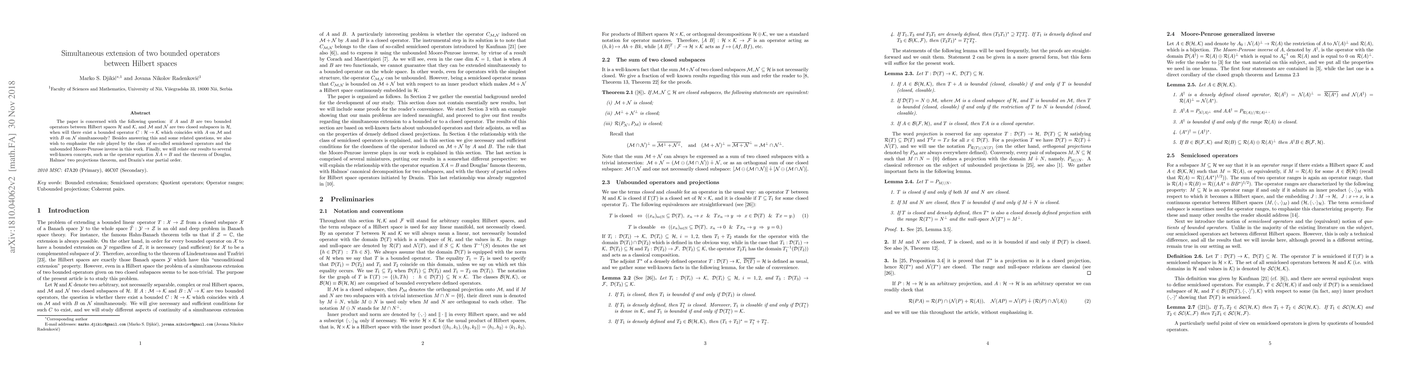 This paper investigates conditions under which two bounded operators $A$ and $B$ between Hilbert spaces can be simultaneously extended to a single bounded operator $C$. It highlights the significance of semiclosed operators and the unbounded Moore-Penrose inverse in addressing this problem, and connects the findings to established theorems like Douglas' theorem and Halmos' two projections theorem.