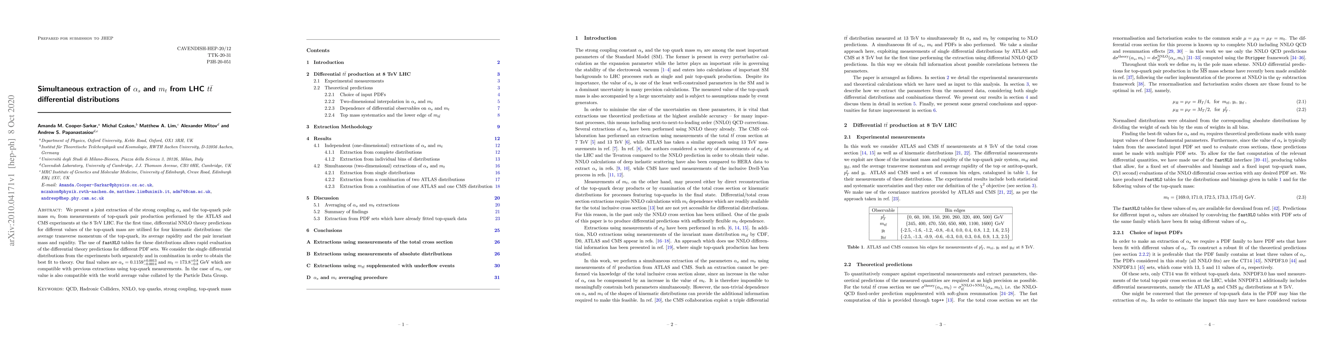 This paper presents a joint extraction of the strong coupling constant $\alpha_s$ and the top-quark mass $m_t$ from differential distributions of top-quark pair production at the LHC, utilizing NNLO theory predictions and combining data from ATLAS and CMS experiments. The final values obtained are $\alpha_s=0.1159^{+0.0013}_{-0.0014}$ and $m_t=173.8^{+0.8}_{-0.8}$ GeV, consistent with previous results and the Particle Data Group average for $m_t$.