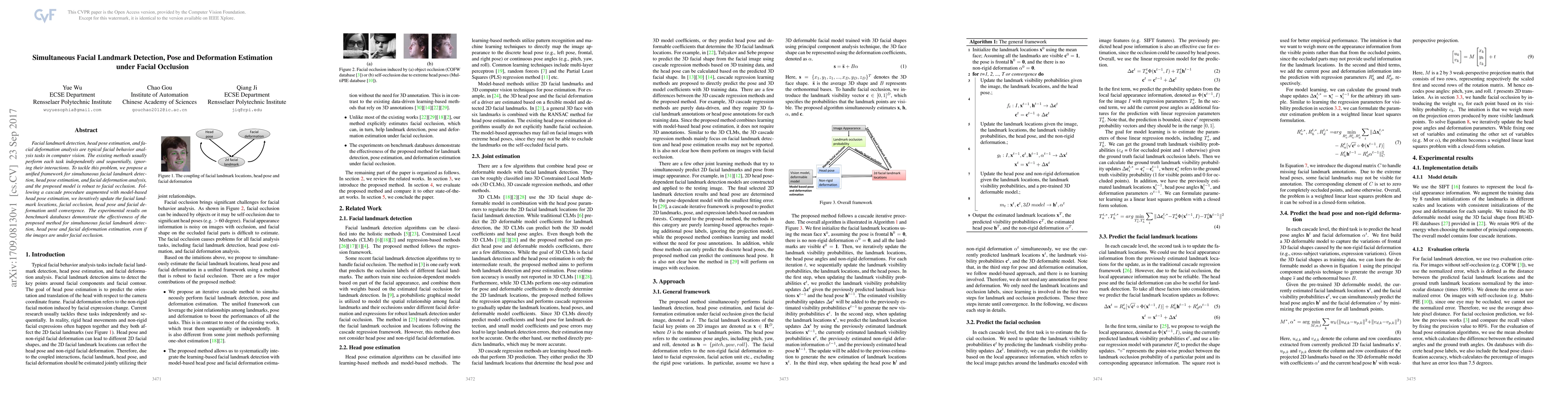 This paper proposes a unified framework for simultaneously detecting facial landmarks, estimating head pose, and analyzing facial deformation, addressing the limitations of existing methods that handle these tasks sequentially. The model is robust to facial occlusion and iteratively refines its estimates through a cascade procedure.