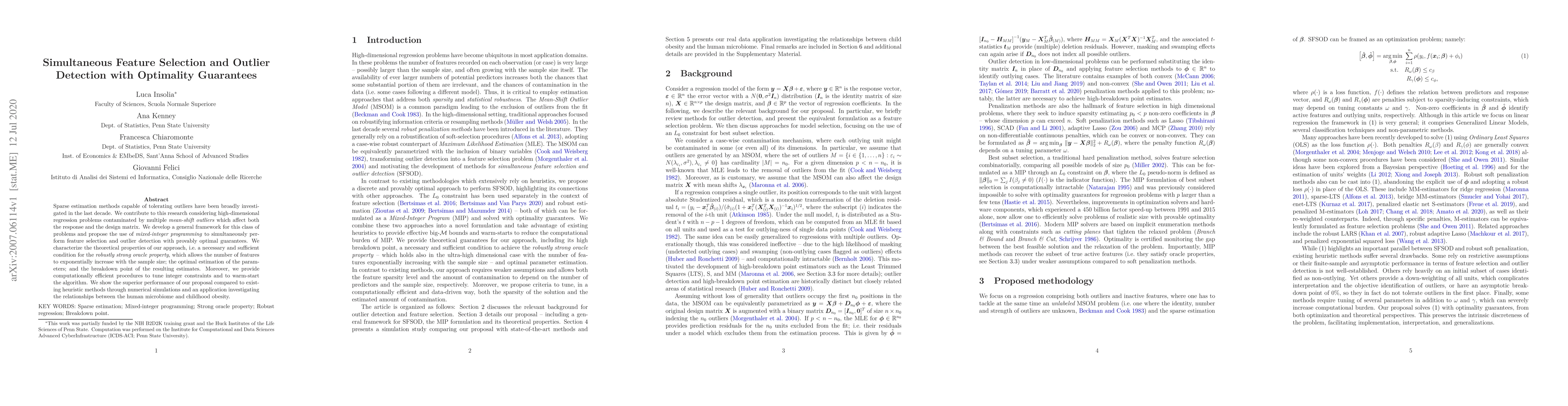 This paper proposes a mixed-integer programming framework for simultaneous feature selection and outlier detection in high-dimensional regression problems, offering optimal guarantees and robust performance against mean-shift outliers. The method achieves superior results compared to heuristics, as demonstrated through simulations and a microbiome study on childhood obesity.