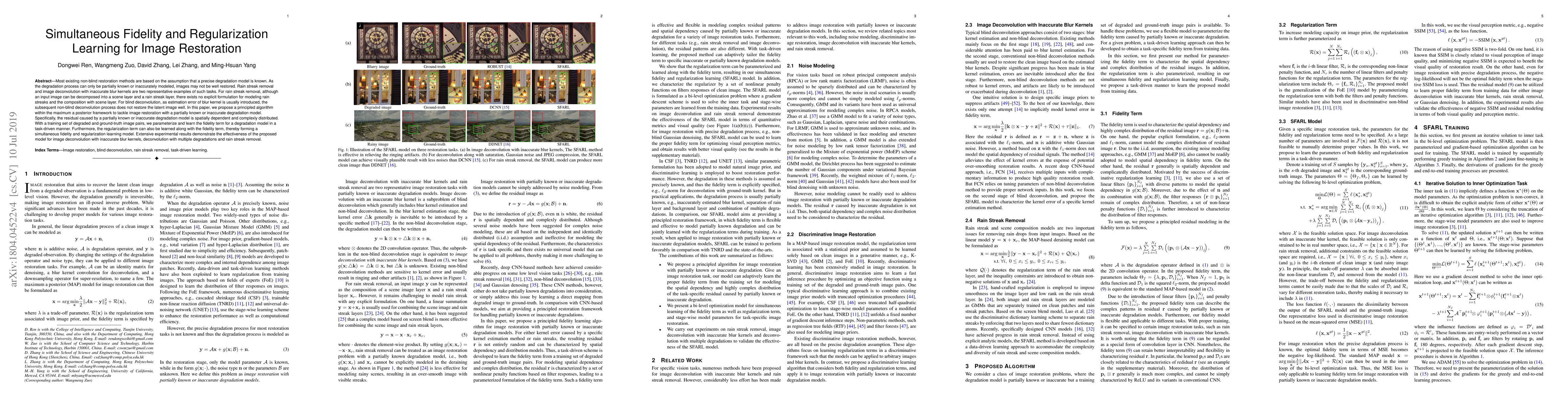This paper proposes a simultaneous fidelity and regularization learning algorithm within a maximum a posterior framework to address image restoration tasks where degradation models are partially known or inaccurate. The method learns both the fidelity and regularization terms from training data to improve restoration in scenarios like rain streak removal and deconvolution with inaccurate blur kernels.