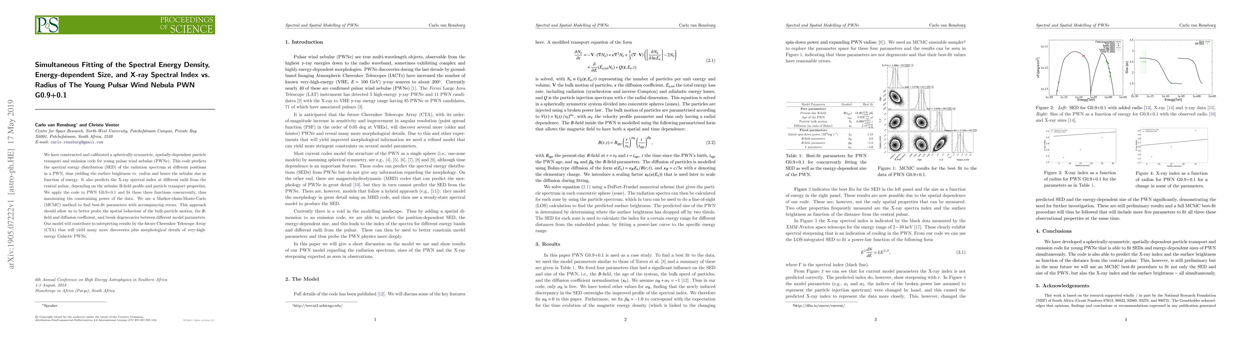 We have constructed and calibrated a spherically-symmetric, spatially-dependent particle transport and emission code for young pulsar wind nebulae (PWNe). This code predicts the spectral energy distribution (SED) of the radiation spectrum at different positions in a PWN, thus yielding the surface brightness vs. radius and hence the nebular size as function of energy. It also predicts the X-ray spectral index at different radii from the central pulsar, depending on the nebular B-field profile and particle transport properties. We apply the code to PWN G0.9+0.1 and fit these three functions concurrently, thus maximizing the constraining power of the data. We use a Markov-chain-Monte-Carlo (MCMC) method to find best-fit parameters with accompanying errors. This approach should allow us to better probe the spatial behaviour of the bulk-particle motion, the $B$-field and diffusion coefficient, and break degeneracies between different model parameters. Our model will contribute to interpreting results by the future Cherenkov Telescope Array (CTA) that will yield many more discoveries plus morphological details of very-high-energy Galactic PWNe.