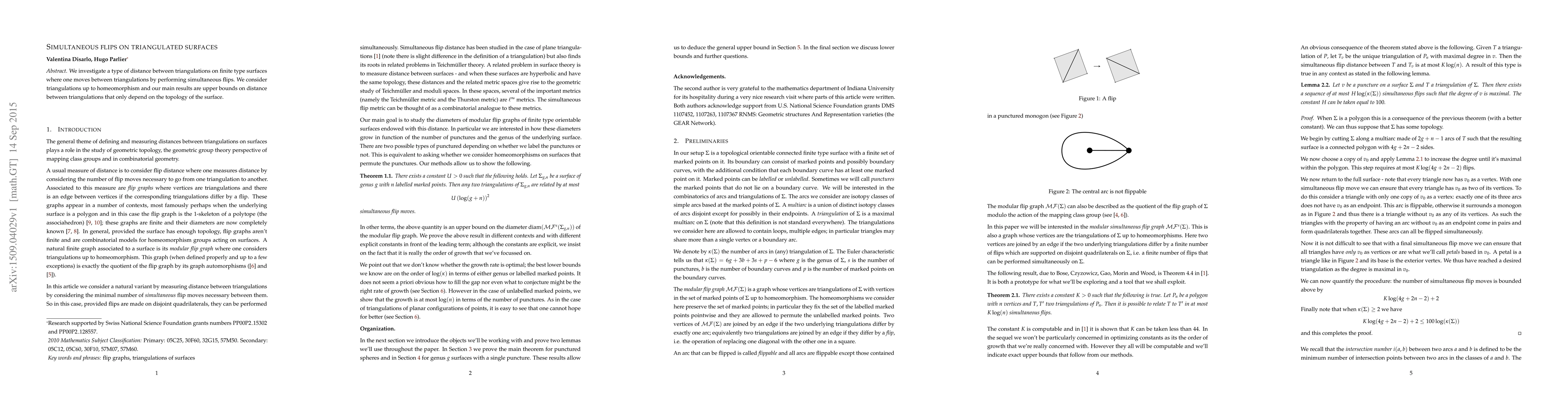 This paper explores the concept of simultaneous flips between triangulations on finite type surfaces, focusing on the topological distance between them. The main findings provide upper bounds on this distance that are solely dependent on the surface's topology, not on specific triangulations.
