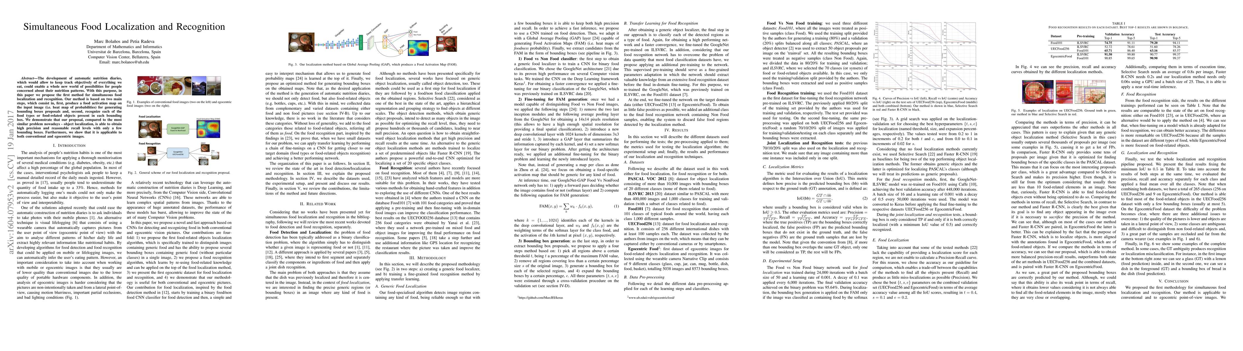 This paper proposes a method for simultaneous food localization and recognition to develop automatic nutrition diaries, achieving high precision and reasonable recall through a two-step process: generating food activation maps for bounding boxes and recognizing food types within them. The method is shown to be effective for both conventional and egocentric images.