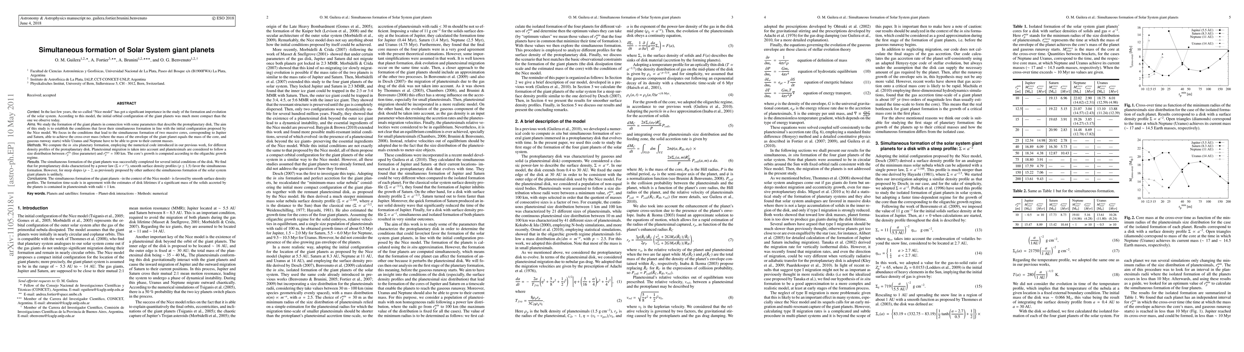 In the last few years, the so-called "Nice model" has got a significant importance in the study of the formation and evolution of the solar system. According to this model, the initial orbital configuration of the giant planets was much more compact than the one we observe today. We study the formation of the giant planets in connection with some parameters that describe the protoplanetary disk. The aim of this study is to establish the conditions that favor their simultaneous formation in line with the initial configuration proposed by the Nice model. We focus in the conditions that lead to the simultaneous formation of two massive cores, corresponding to Jupiter and Saturn, able to achieve the cross-over mass (where the mass of the envelope of the giant planet equals the mass of the core, and gaseous runway starts) while Uranus and Neptune have to be able to grow to their current masses. We compute the in situ planetary formation, employing the numerical code introduced in our previous work, for different density profiles of the protoplanetary disk. Planetesimal migration is taken into account and planetesimals are considered to follow a size distribution between $r_p^{min}$ (free parameter) and $r_p^{max}= 100$ km. The core's growth is computed according to the oligarchic growth regime. The simultaneous formation of the giant planets was successfully completed for several initial conditions of the disk. We find that for protoplanetary disks characterized by a power law ($\Sigma \propto r^{-p}$), smooth surface density profiles ($p \leq 1.5$) favor the simultaneous formation. However, for steep slopes ($p\sim 2$, as previously proposed by other authors) the simultaneous formation of the solar system giant planets is unlikely ...
