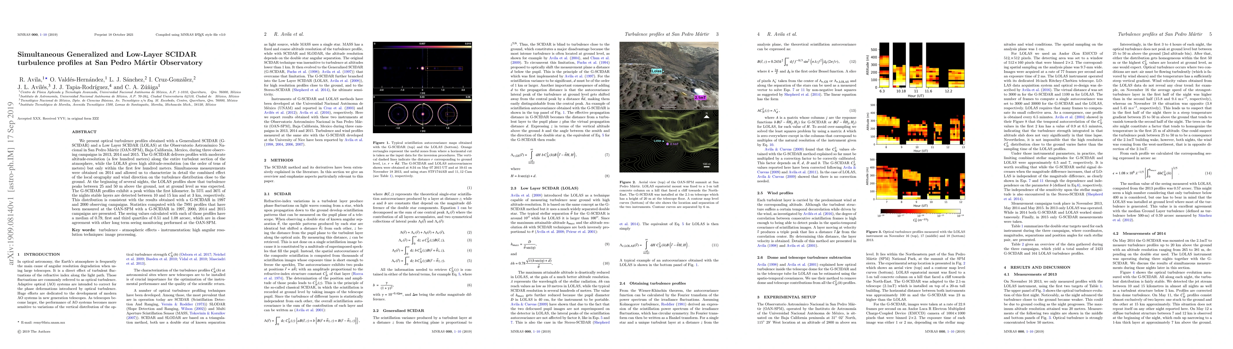 This study presents turbulence profiles from Generalized SCIDAR (G-SCIDAR) and Low Layer SCIDAR (LOLAS) at the San Pedro Mártir Observatory in Mexico, revealing turbulence peaks between 25-50 m above ground and stable layers at 10-15 km and 3 km. The seeing values calculated have a median of 0.79 arcsec, consistent with long-term monitoring.