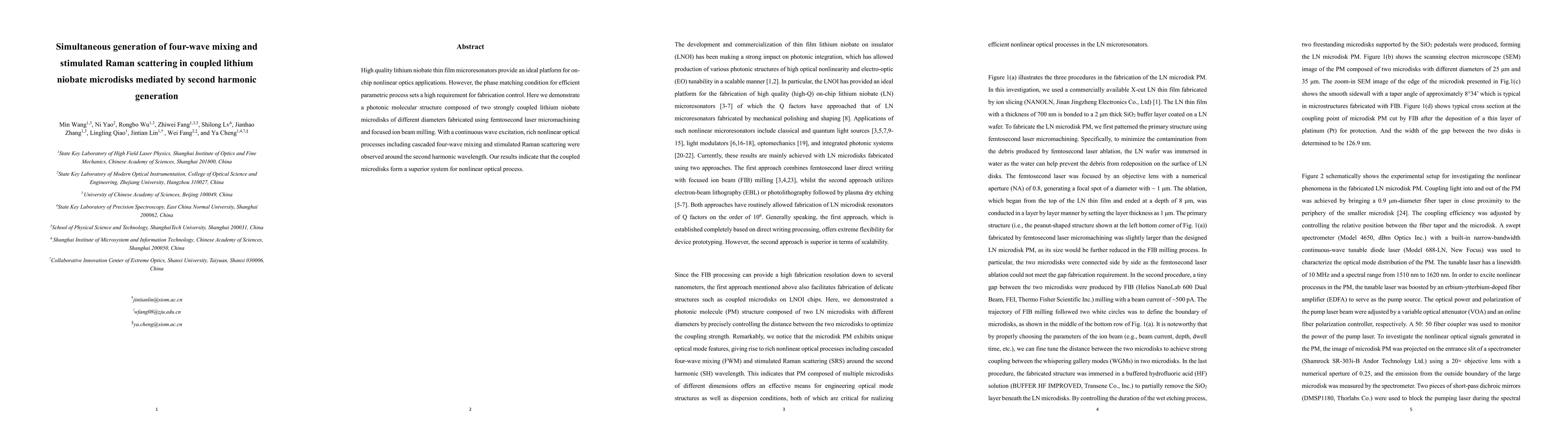 Summary: Researchers created coupled lithium niobate microdisks using advanced fabrication techniques, showing simultaneous generation of four-wave mixing and stimulated Raman scattering via cascaded nonlinear optical processes around the second harmonic wavelength, demonstrating their effectiveness for on-chip nonlinear optics.