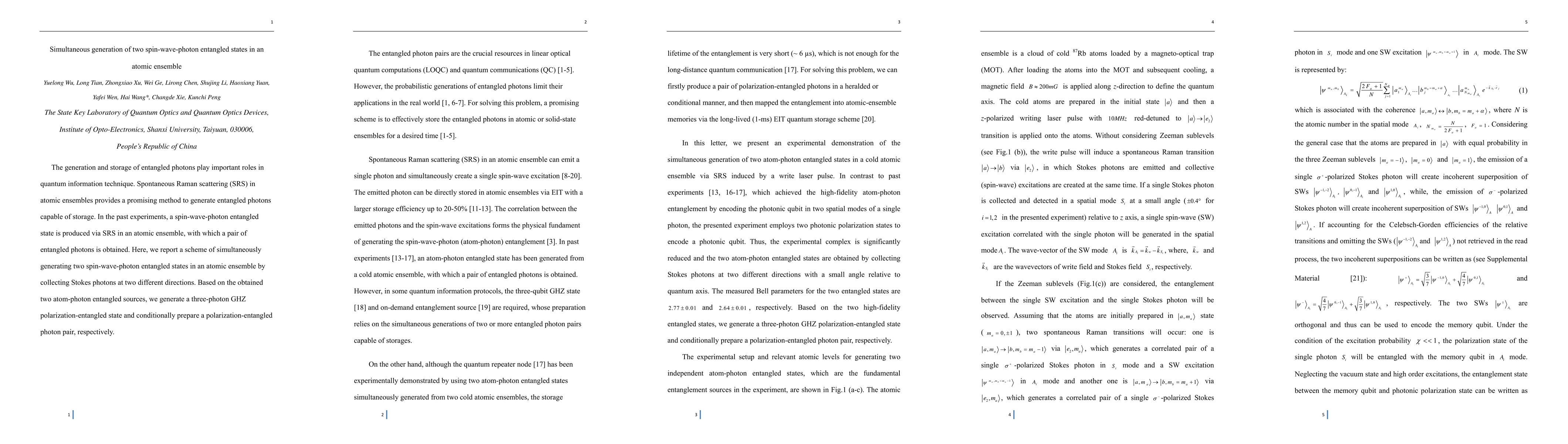 This paper presents a method for simultaneously generating two spin-wave-photon entangled states using spontaneous Raman scattering in an atomic ensemble. The study demonstrates the generation of a three-photon GHZ state and a conditional polarization-entangled photon pair from these entangled sources.
